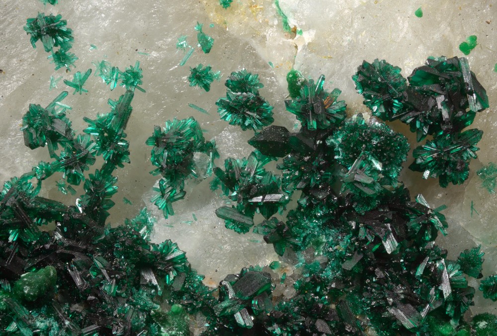 Brochantite était aussi ma première idée. Ceci dit la distinction visuelle entre les 2 espèces est vraiment délicate : Brochantite - Cap-Garonne - champ 10.5mm Atacamite - Mount Gunson Copper mines, Australie - Champ 18mm Si tu peux avoir du chlorure de baryum (demandes à un prof de chimie de collège) : Dans un verre de montre, dissolution d'un cristal dans l'acide chlorhydrique, puis une goutte de solution de chlorure de baryum. En présence d'ions sulfate (brochantite), précipité blanc de sulfate de baryum (baryte). Pas de réaction si c'est de l'atacamite. Fifi... 63 : Puy de Dôme ? Si tu viens à la bourse de Chatel-Guyon ce week-end, je serai là les 2 jours au stand micro et je pourrai faire le test. Dis le moi juste dans de post, que j’emmène l'acide et le chlorure de baryum. Demandes Pascal.