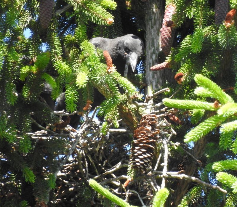 Je n'ai pas pris le risque de spécifier l'espèce , le peu de détails des photos laisse planer un doute , vous voyez des choucas , je verrais plus des corneilles noires , pour en voir tous les jours leur mode de vie ne ressemble pas à celui des choucas , pas de rassemblement , toujours en couple , nidification à la cime des arbres ,sapins et chênes. Exemple dans mon jardin. La nichée prête à prendre son envol -
