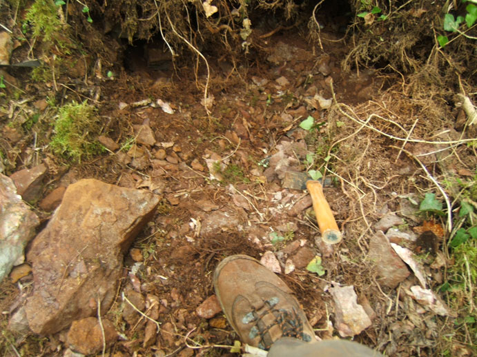 18. On arrive face à une ruine à partir de laquelle il faut maintenant faire 150 m vers la droite avant d'arriver devant l'entrée d'une ancienne mine dont l'entrée est obstruée par un tas d'arbres