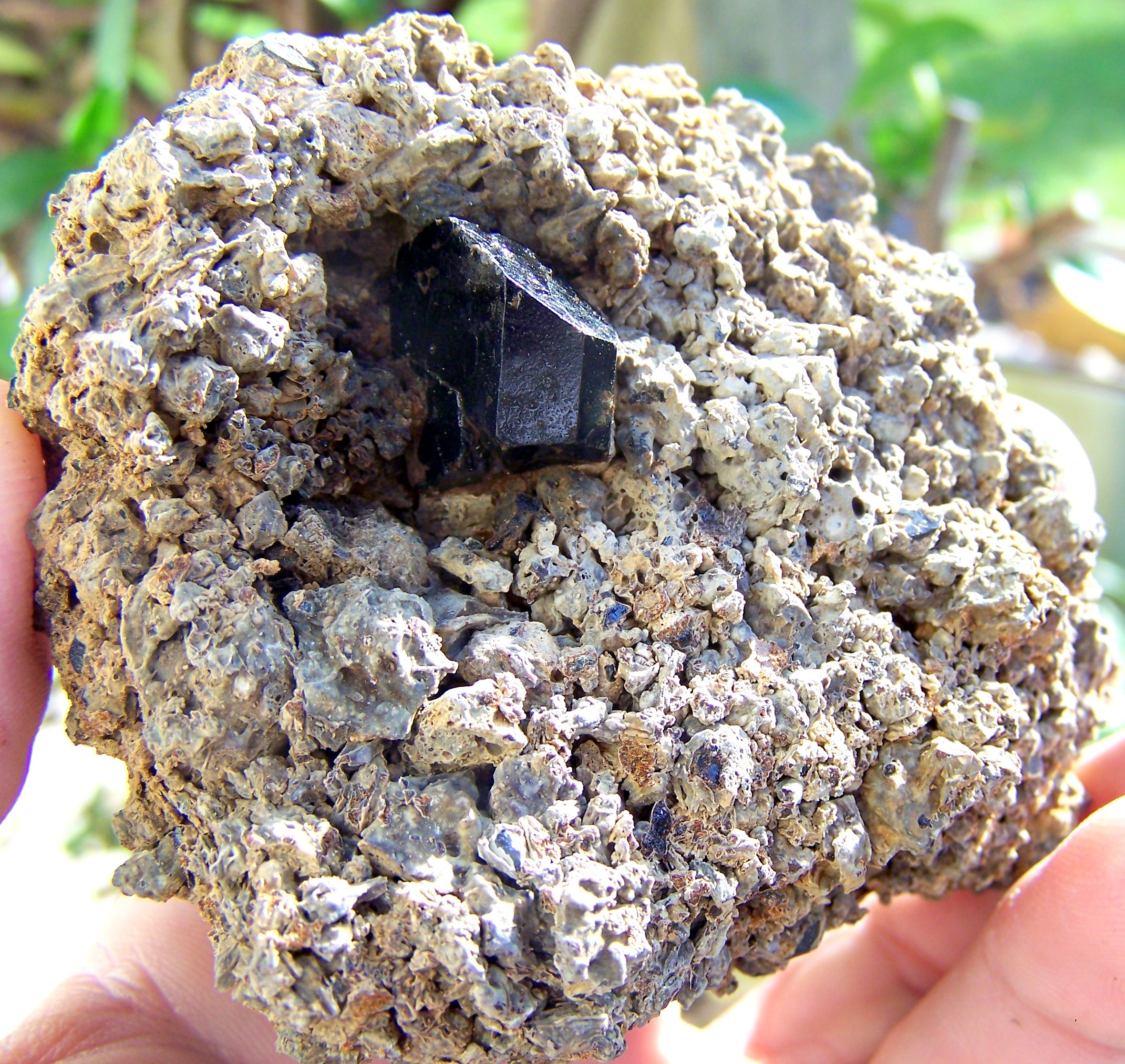 Bonsoir Une curiosité des Canaries, ile de la Palma. Un cristal de fassaite entourée de cristaux d'augite dans un tuf volcanique. Cordialement. -