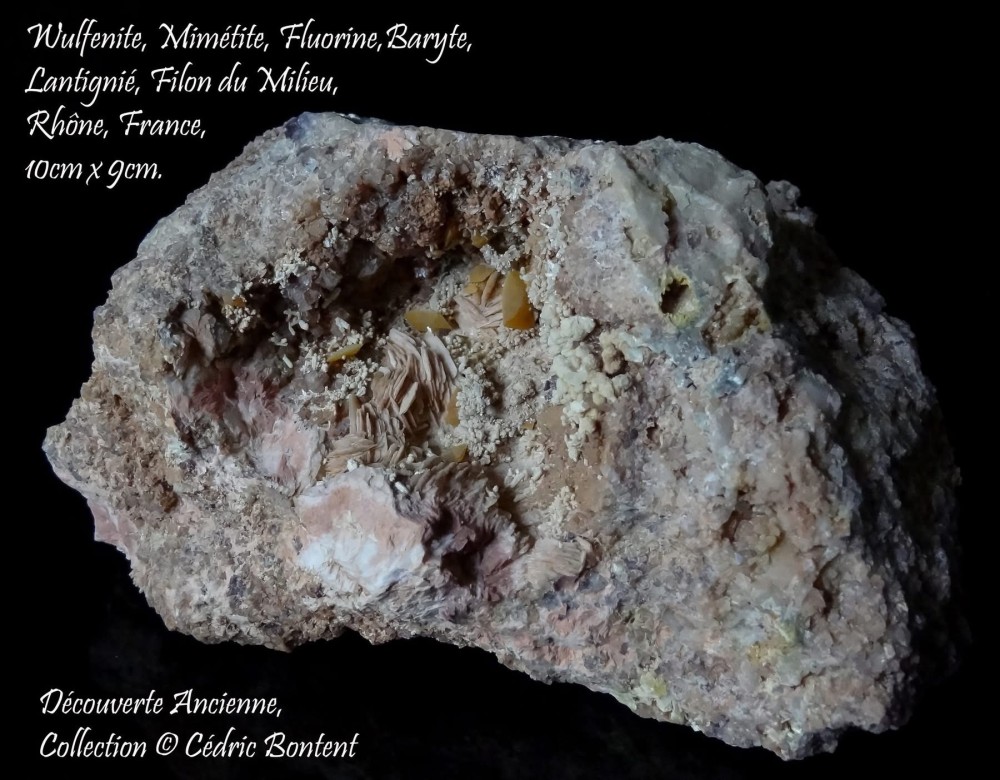 Un échantillon de Fluorine accompagnée de Mimétite, Wulfénite, Barytine et petits cubes de fluo violacés.