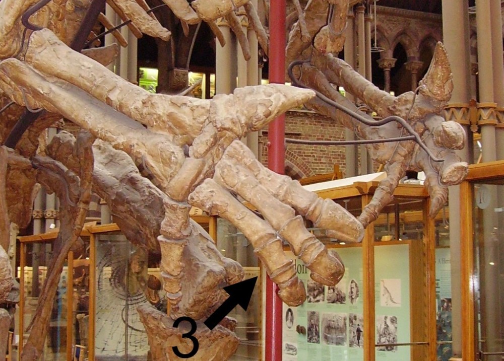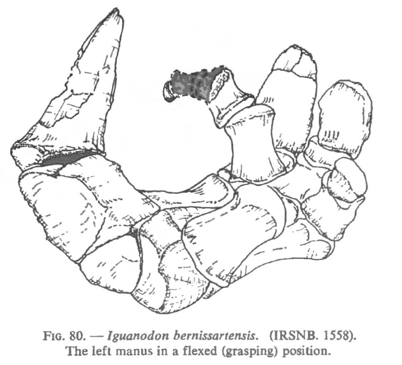 C'est bien mon problème en ce moment. Les Iguanodons ont tellement été "retouchés" par le préparateur De Paw, et non par Dollo, que l'on a du mal à se faire une opinion. Dans "The Dinosauria, 1990" p 527 David Norman donne deux reconstitutions des mains Iguanodons en citant sa publication de 1980 dans laquelle ces illustrations ne figurent pas! Dans sa publication de 1980 il indique qu'il a utilisé le spécimen IRSNB 1558 main gauche et extrémité du radius et de l'ulna gauche où le carpe est parfaitement conservé. C'est le spécimen exposé au British Muséum et à Bruxelles.