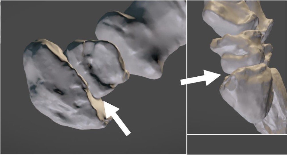 Quelle est l'origine du plan des trâces anglaises? Comme tu dis un sacré méli-mélo. Surtout que je trouve que sur la numérisation 3D l'extrémité de la phalange 2 ressemble tout de même beaucoup à une surface articulaire.