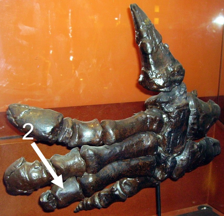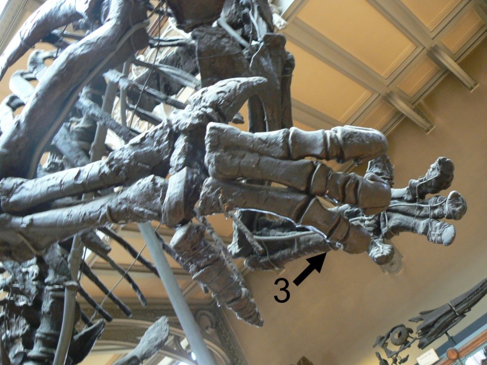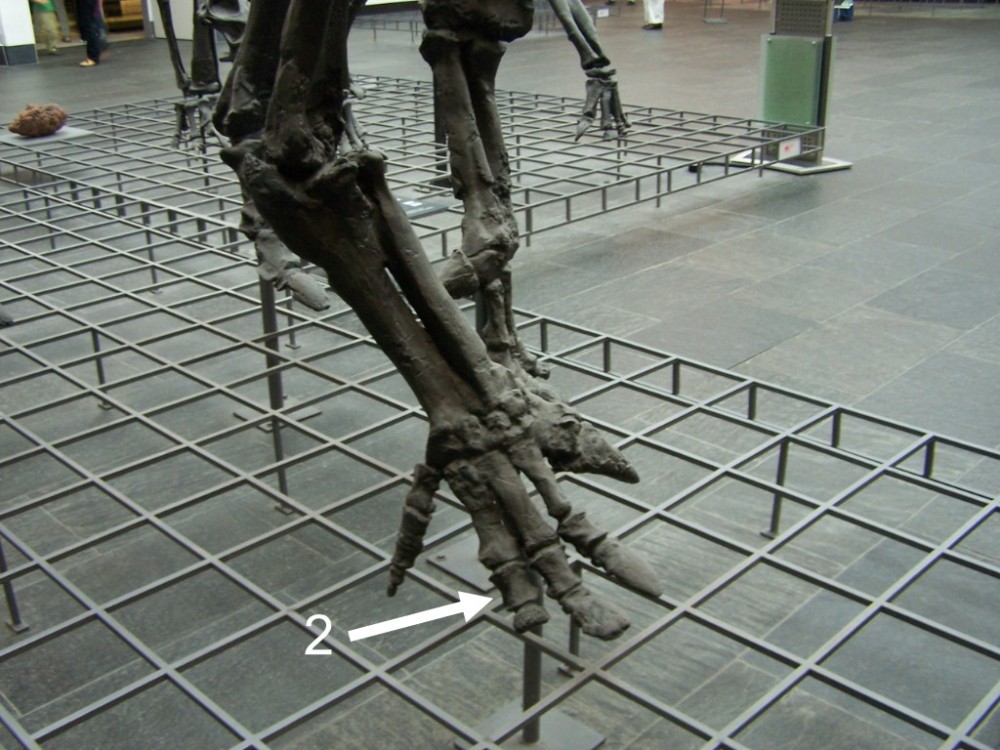 Un truc pour lequel je n'ai pas trouvé de réponse claire c'est l'orientation du plan de la main par rapport à l'axe du corps. Logiquement d'aprés la forme du radius et du cubitus la main de vrait être paralléle à l'axe du corps. Au cours de la marche l'appuis devait alors se faire successivement sur le doigts IV, puis le III et enfin le II. A Bruxelles le squelette remonté en position quadrupède (voir photo) a sa main en appuis perpendiculaire à l'axe du corps et la main levée parallèle. Pour ce faire il faudrait que le radius puisse tourner sur son axe au niveau du coude