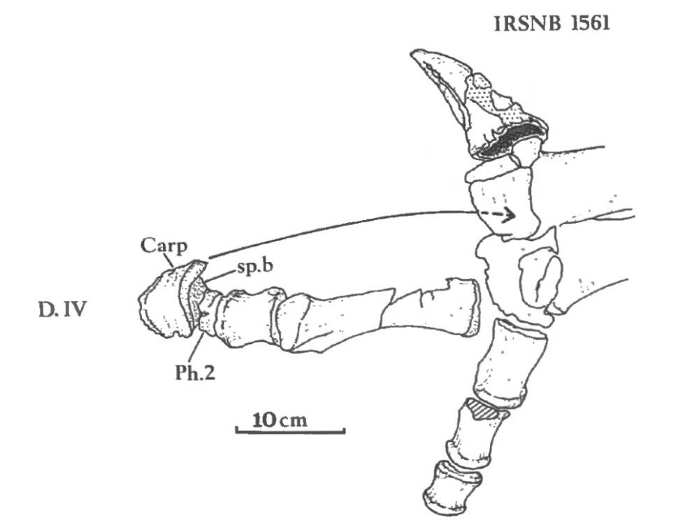 Autre problème le nombre de phalanges au doigt IV: 2 ou 3? Selon D. Norman la troisième phalange serait un os carpien mal positionné. "La « troisième » phalange de ce doigt a été reconstruite par erreur comme un petit élément nodulaire par DOLLO (1882 : pl. IX, fig. 3). Cependant, plusieurs des squelettes reconstruits : IRSNB. 1534 (l'holotype) IRSNB. 1561 et IRSNB. 1657, sont reconstruits avec des variations même avec la restauration de DOLLO. Le squelette holotype (IRSNB. 1534) qui a été figuré par DOLLO (1882, 1883) a eu une restauration au plâtre du quatrième doigt des mains gauches et droites (fig. 61 c, d - zones pointillées). Les deux, tels qu'ils sont actuellement restaurés, possèdent trois phalanges sur le quatrième doigt, la dernière étant un gros unguéal aplati en forme de sabot. La base de cette restauration ne peut être que la preuve de la structure de la main dans les spécimens IRSNB. 1561, 1657 ; ces deux spécimens semblent posséder de larges os unguéaux sur le quatrième doigt (fig. 62). Ces deux spécimens ont depuis été examinés afin de confirmer la restauration originale de DOLLO. Dans les deux cas, la « phalange unguéale » s'est avérée être un fragment osseux en forme d'ongle provenant du carpe et, comme indiqué, ces spécimens peuvent être placés dans leurs positions correctes sur le carpe." La main numérisée serait une reconstruction d'aprés DOLLO Quelques photos de mains