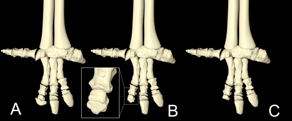 Oui c'est tout a fait ça. Cette troisième phalange me rappelle l'adage :"L'absence de preuve n'est pas la preuve de l'absence". Personnellement, je trouve que ce doigt IV fait amputé sans revetement corné à l'extrémité.