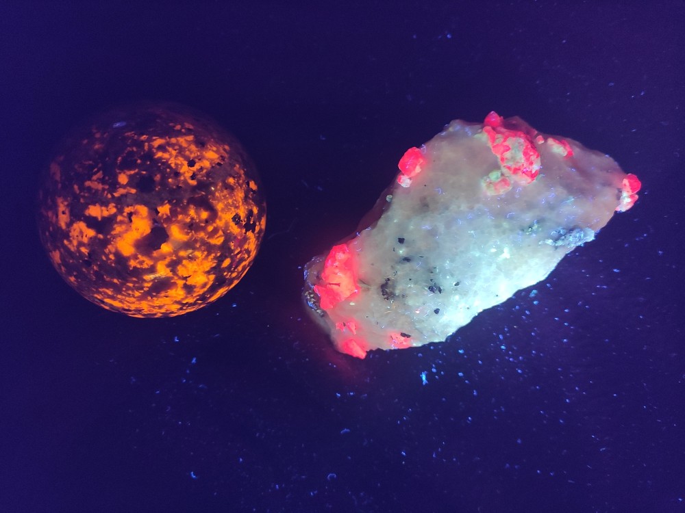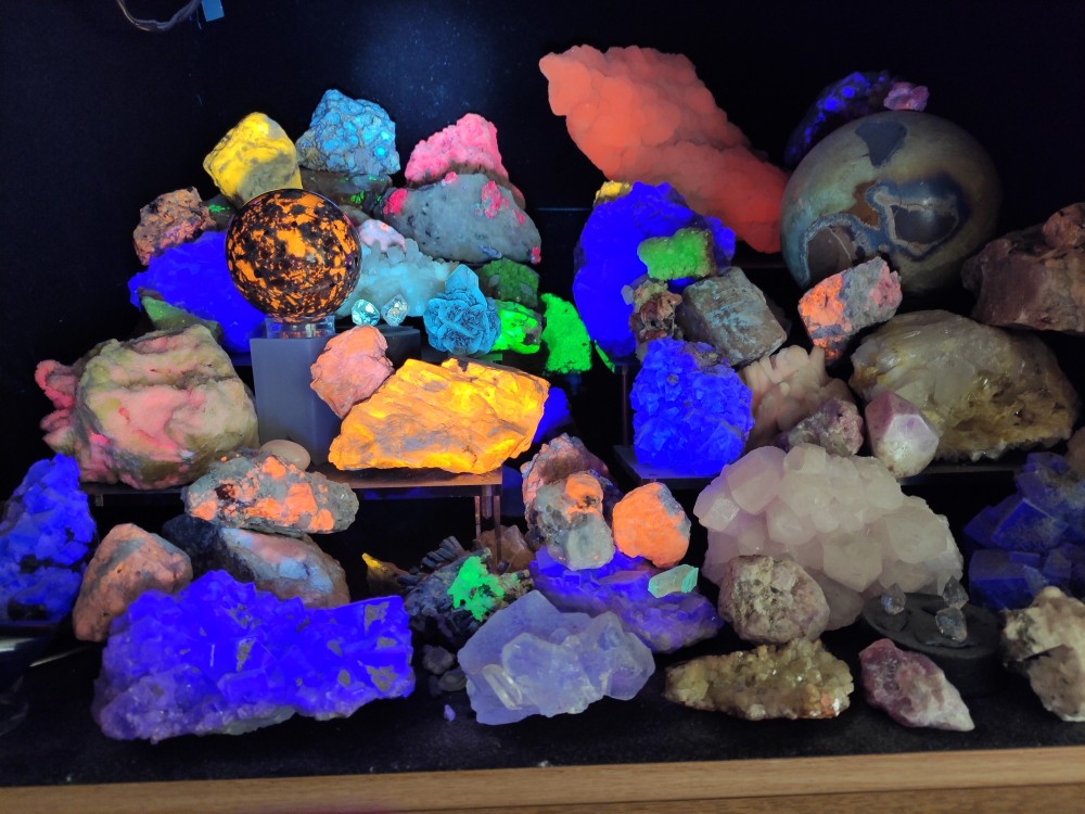 Le résultat est tout à fait bluffant sur une vitrine où l'on trouve un peu de tout ce qui réagit en UV longs( fluorites, rubis, manganocalcites, ambre, autunites, Yoo perlite apatite, sodalite, adamites etc...