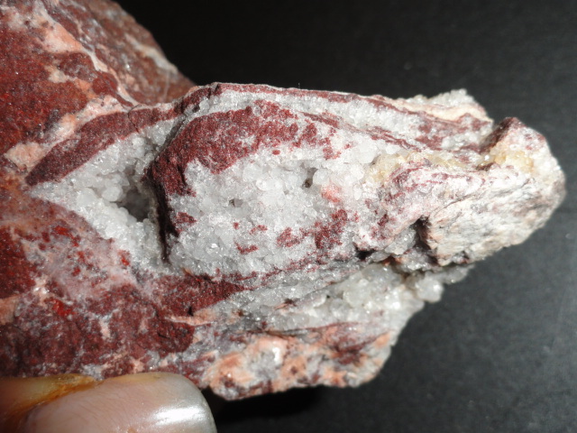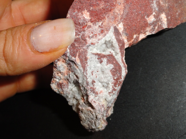 pour la 2eme pierre rouge brique , j'ai fait le test de dureté , elle est rayable avec un couteau sur sa surface rouge foncé brillante et rayable avec une pièce en cuivre sur sa surface rouge clair fibreuse et horreur !! je voulais voir le clivage , j'ai donné un petit coup de marteau dans la pointe qui ne portait pas les géodes et la pierre s'est cassée en 2 !!!!! je suis dégoutée ! je profite pour faire une photo de l'interrieur -