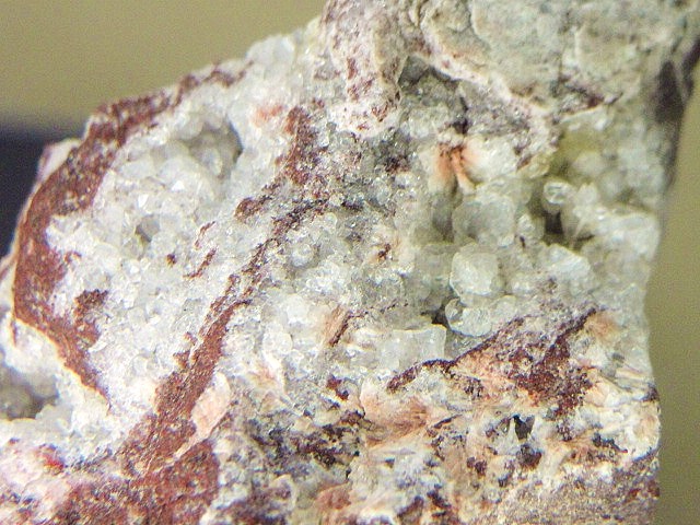 alors pour l'acide chlorhydrique , j'ai pas osé avec la 1er pierre car elle est rayable à l'ongle , elle est aussi entièrement doré , j'avais peur d'abimer la couleur or ( j'avais pensé à de la sidérite ??) pour la 3 eme quelques gouttes d'acide qui ont réagit de suite : effervescence , j'ai vite arreté pour la 2 eme je l'ai trempé dans l'acide , j'esparais faire briller davantage les petits cristaux qu'on voit dans le " nid ', sa partie rouge brille mais ça n'apparait pas à la photo , sur une autre face la couleur rouge est plus clair et sans brillance et fibreuse ( photo ci contre ) autre vue du " nid " de cristaux -