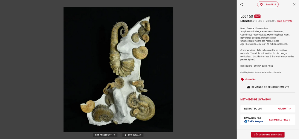 Bonjour Je suis tombé par hasard sur ces d'ammonites françaises que je trouve très belles (mais je n'y connais pas grand chose en fossiles et je n'envisage pas de les acheter 🙃🤣) elles sont mises aux enchères cette après-midi à l'hôtel des ventes d'Evreux. Hormis le prix que je ne commente pas (auquel il faut ajouter 27% de frais...), les spécialistes du sujet pourraient-ils me dire si l'ensemble parait crédible ? Merci de votre expertise -