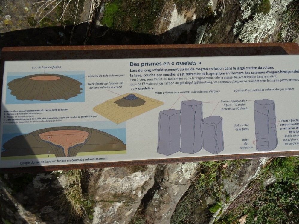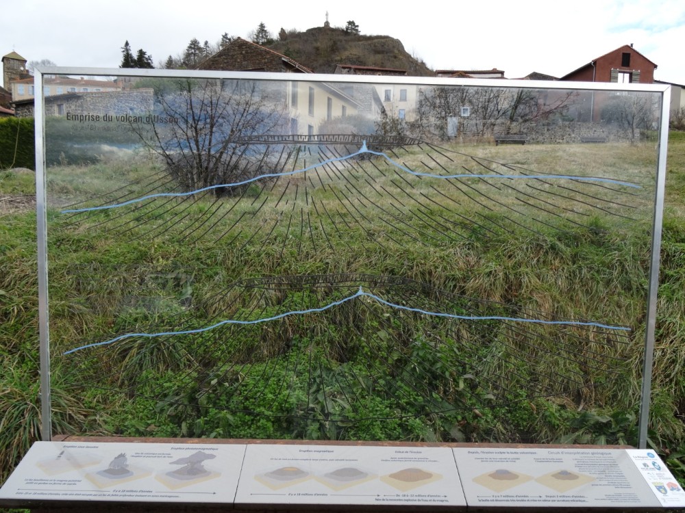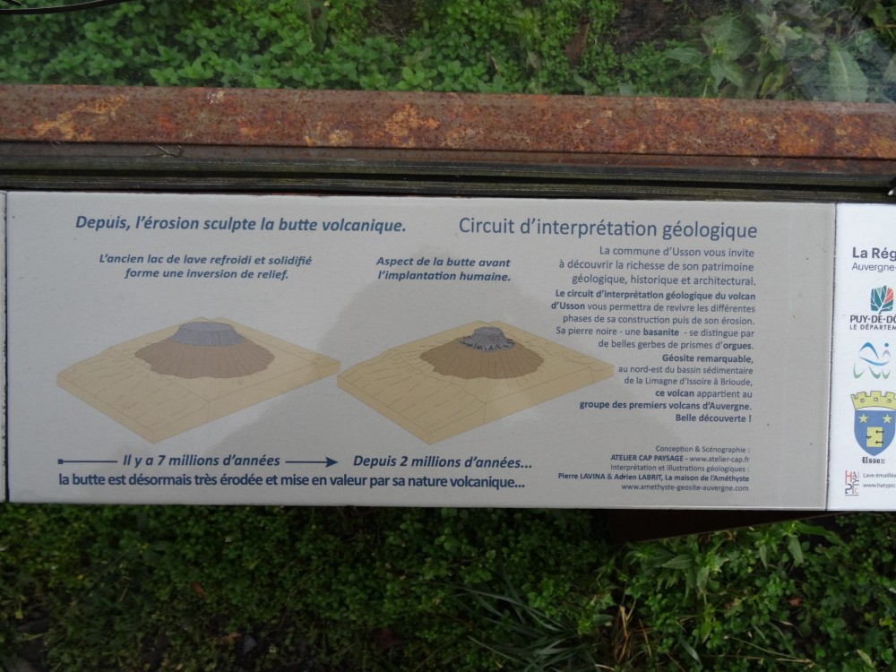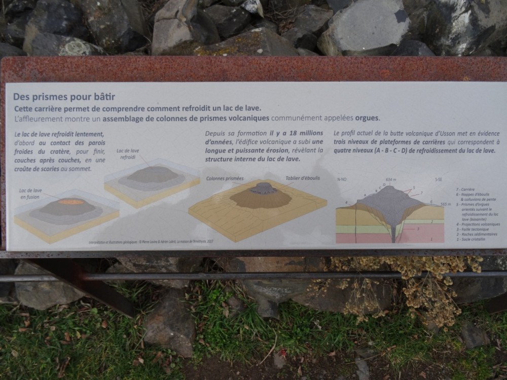 Merci à vous. Les plaques émaillées et les tables d'orientation (ces dernières non photographiées) sont l’œuvre de Marie et François Lienhard, céramistes à Usson. Ce sont surtout eux qu'on devrait remercier, grâce à leur travail, la visite de ces lieux prend une toute autre dimension que celle d'une simple balade, que l'on s'intéresse à la géologie, à l'histoire... ou aux deux