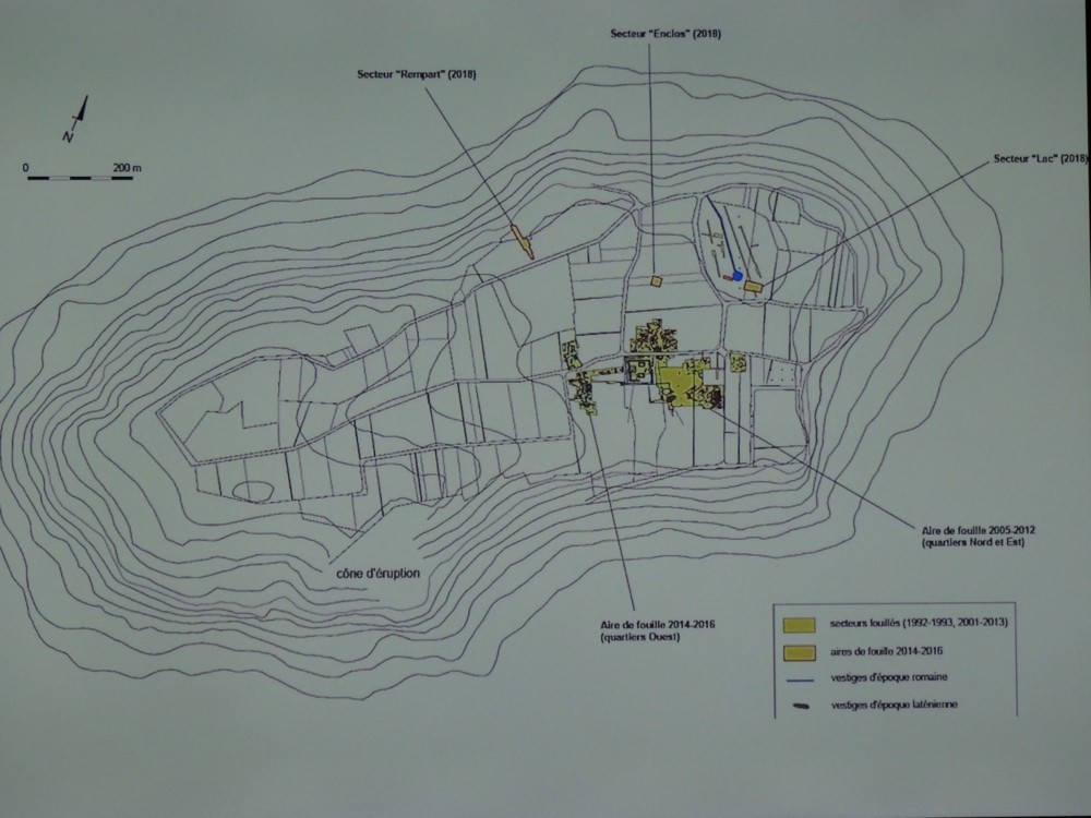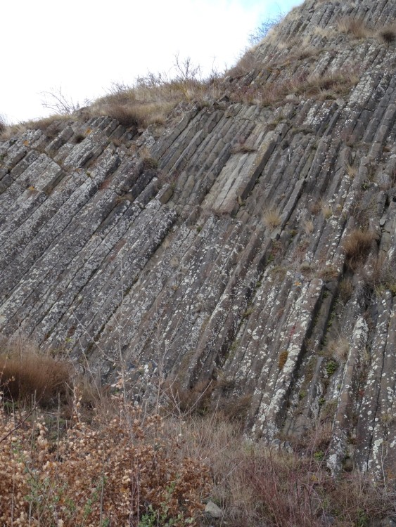 Balade aux alentours et dans le village de Corent (Puy-de-Dôme) le 02/01/2022 et le 11/01/2022 Le village est édifié sur le flanc d’un plateau basaltique mis en relief par la lente érosion des terrains sédimentaires environnants. Les bords escarpés du plateau rendent son accès difficile et cette particularité a été utilisée dès la préhistoire dans un but défensif. Des fouilles ont révélé une richesse archéologique exceptionnelle et attestent une occupation du sommet de la butte à partir du Néolithique. De très nombreux objets (du Néolithique jusqu’au Moyen Age) y ont été découverts, certains sont exposés dans des musées. Corent est aussi connu pour son activité viticole. Aujourd’hui, il ne reste que 5 exploitations produisant uniquement du rosé issu de cépages gamay noir et pinot noir bénéficiant des appellations AOC et AOP. Cependant, dès le Xeme siècle, le vin de Corent jouissait d’une bonne réputation, au XVIIIème il avait même conquis le marché parisien grâce aux ports des Martes-de-Veyre et de Mirefleur situés sur la rivière Allier qui permettait ensuite de rejoindre la Loire, le canal de Briare et la Seine . L’entrée du village, avec la falaise basaltique en arrière plan En flânant dans les ruelles étroites, les entrées voûtées n’échappent pas au regard et rappellent la présence des vignes aux alentours. Sur cette photo, on peut remarquer le cuvage au niveau de la route (derrière la porte en bois se trouvaient les cuves de vinification) qui communique avec la cave, située au dessous et où était stocké le vin (entrée au bas gauche de la photo). Quelques maisons vigneronnes… … certaines inoccupées Le commencement de la production vinicole en Auvergne remonte au début de la présence romaine, soit aux alentours de 50 avant J.C. Au XIème siècle on recense 10.000 ha de vignes, mais c’est à partir du XVIème siècle et du règne d’Henri IV que les divers crus (Chateaugay, Chanturgue ou encore Corent…) acquièrent leur notoriété. Au XIXème siècle l’Auvergne compte 45.000 ha dédiés à la viticulture (moins de 800 aujourd’hui), le Puy-de-Dôme est le troisième département français par la quantité de vin produite. A partir de 1895 et l’arrivée du phylloxéra, le vignoble auvergnat, dans lequel est inclus celui de Corent, amorce son déclin et il ne s’en relèvera pas. Quinze ans plus tard, c’est le mildiou qui va parachever l’œuvre du précédent parasite. L’un des passages permettant de communiquer entre les habitations Un nom de rue en accord avec le visuel… Eglise du Xème siècle, dont le coeur est orienté au nord et non à l’est qui est quasiment la règle en usage. On attribue la raison de l’orientation à l’est au levé du soleil qui apporte la lumière et triomphe ainsi des ténèbres… C’est probablement le manque de place lors de la construction de l’édifice qui eut raison de la tradition. Une rue du village Dans la falaise qui surplombe les maisons, des grottes ont été creusées… dans le basalte ! Les parties maçonnées laissent penser qu’elles furent habitées. La plus grande mesure 15 mètre par 7 mètres. « Les prismes basaltiques verticaux, de grande taille, sont segmentés par des diaclases plus ou moins horizontales favorisant leur débit et altération en boules (naissante ici). Leur géométrie très irrégulière ne permet pas un creusement rationnel… Pic et pointerolle n'ont eu ici qu'un rôle secondaire dans le creusement. La séparation des prismes, leur dislocation, font appel à des outils utilisés comme leviers ou s'effectuent sous l'effet de chocs. » Source : site de la commune de Corent Deux autres grottes sur lesquelles n’apparaissent pas d’éléments maçonnés Deux vue du village Visite du sommet du plateau et de son site archéologique Panneau précisant les périodes de fréquentation ou d’occupation des lieux Photo de l’un des chantiers de fouilles en 2011 Même endroit aujourd’hui et après les travaux de restauration du petit théâtre (41 mètres de côté). D’après les éléments de décor muraux et le mobilier mis au jour lors des fouilles, il a été actif entre le début du premier siècle et la fin du IIème siècle après J.C . Deux photos d’objets découverts lors des fouilles, disposées sur des panneaux didactiques Plan du site archéologique et du plateau de Corent Commentaires relevés sur l’un des panneaux du site : « Les objets retrouvés sur le sanctuaire et à ses abords témoignent, par leur nombre et par leur qualité, de la richesse des occupants de la cité. La découverte de trophées d’armes constitués avec les dépouilles prises à l’ennemi, de crânes humains, de bijoux précieux et de statuettes zoomorphes, illustrent le rôle central du sanctuaire, dans la vie religieuse, politique et économique de la cité. Plusieurs milliers de monnaies en bronze et en argent ont été recueillies… ». Autant dire que cette balade m’a donné envie d’en savoir plus. Donc, dans les prochains jours une visite au musée Bargoin s’impose… … mais avant de quitter les lieux : le puy de Saint Romain vu du sommet du plateau… … et du même endroit, à gauche du pont: la papeterie de la Banque de France installée au bord de l’Allier en raison de ses besoins en eau Retour au village. Face au manque d’enthousiasme du chat, j’ai hésité… puis renoncé à le caresser en guise d’au revoir (un cou de patte, ça laisse des traces !)… Visite du musée Bargoin et d’une petite partie des objets découverts sur le plateau de Corent. Le 11/01/2022, visite de la carrière de pouzzolane située sur le bord du plateau de Corent Mais avant de rejoindre le plateau, un amas d’orgues basaltiques attire mon regard A quelques mètres du dépôt, je me rends compte qu’elles sont utilisées pour l’édification d’un mur de soutènement Le résultat est esthétique et question solidit
