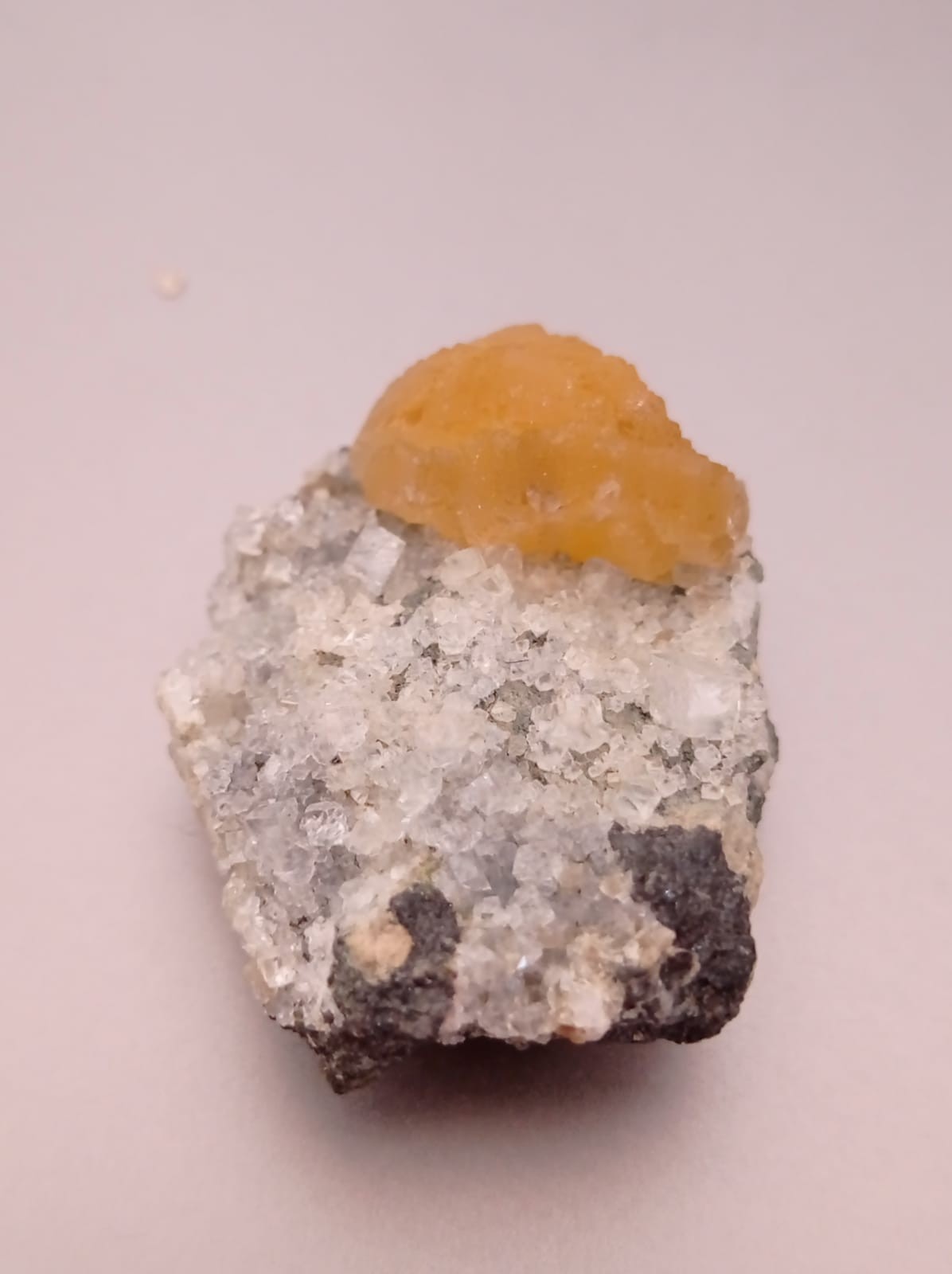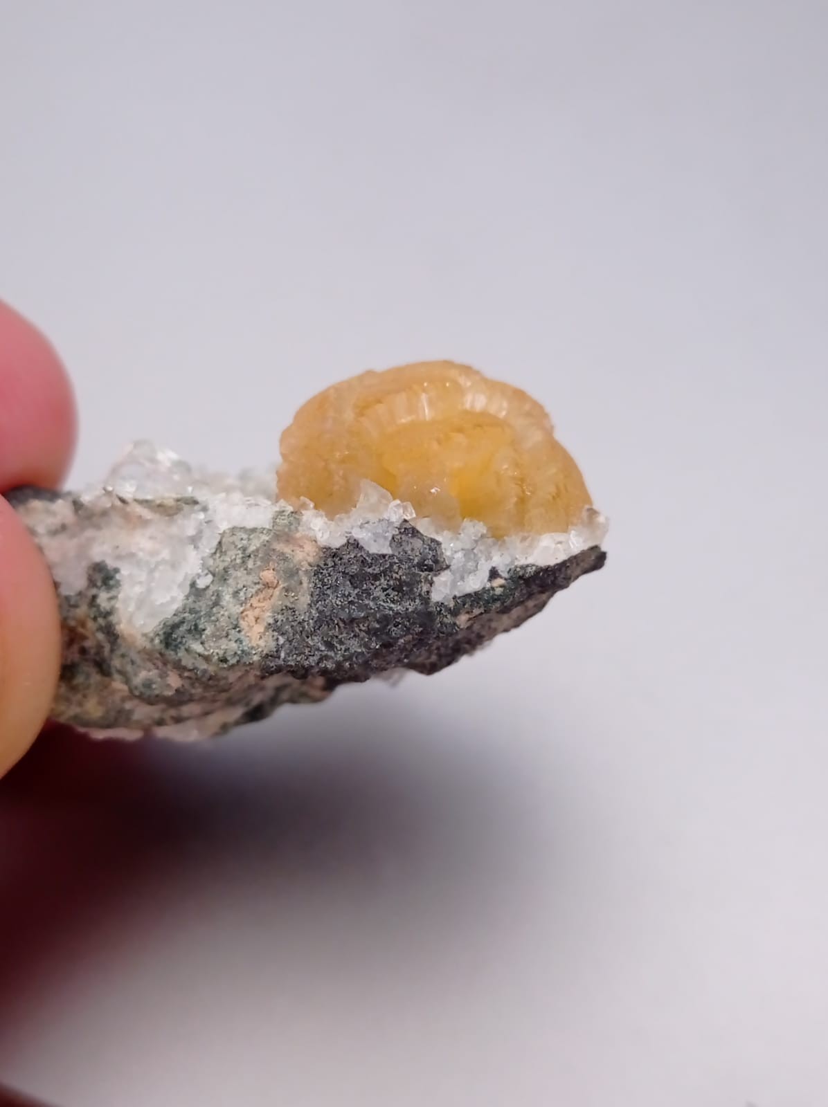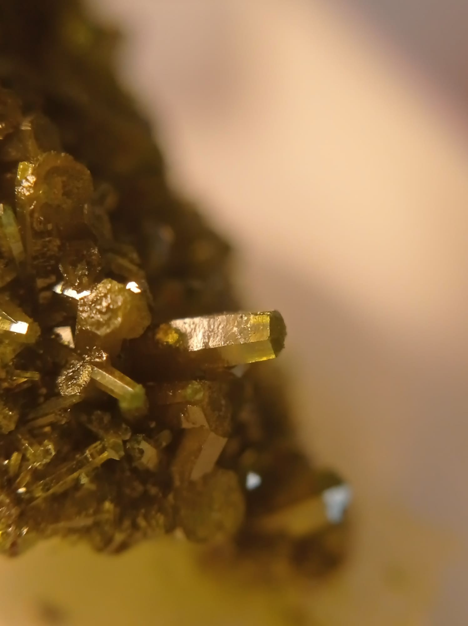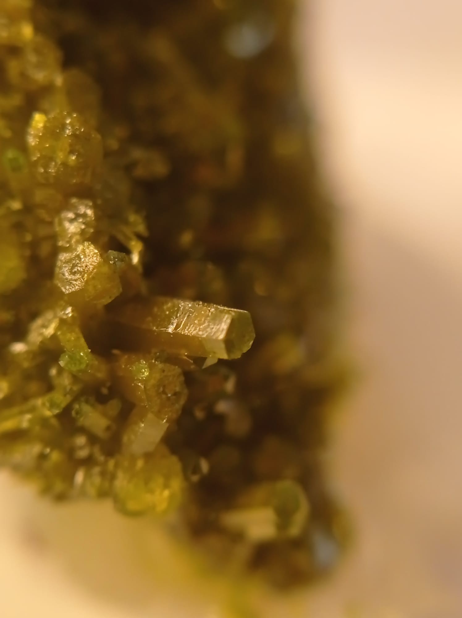 J'ai fais un petit test de dureté, il raye clairement la calcite, mais n'a pas l'air de rayer la fluorite. Du coup, la dureté et le système cristallin colle avec la pyromorphite. Mais peut-être que l'habitus et l'aspect ne collent pas?
