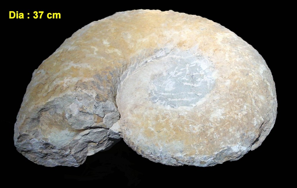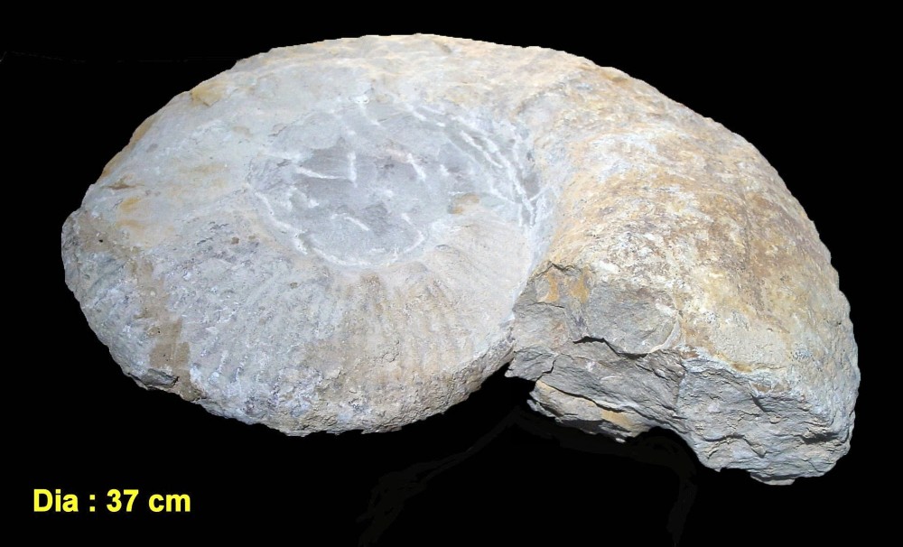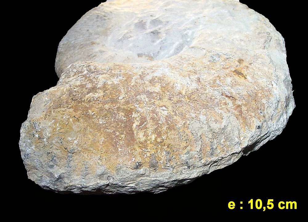 Bonjour, Étant en train de classer mes ammonites quelqu’un aurait il une idée sur le nom de celle-ci ? C’est un ami qui me l’avait donnée mais il est malheureusement décédé et donc ne peut avoir des infos. La seule chose que je connaisse et le pays d’où elle provient, le Maroc ! Le diamètre est de 37 cm et son épaisseur maxi est de 10,5 cm Je joins 4 photos (2 de chaque face, une de la section et une où sont les cotes les plus visibles) Merci d’avance pour vos idées Cordialement P. Maurette -