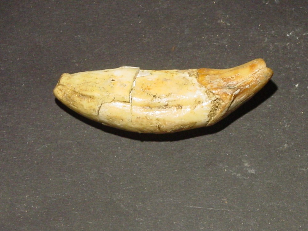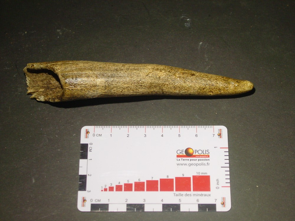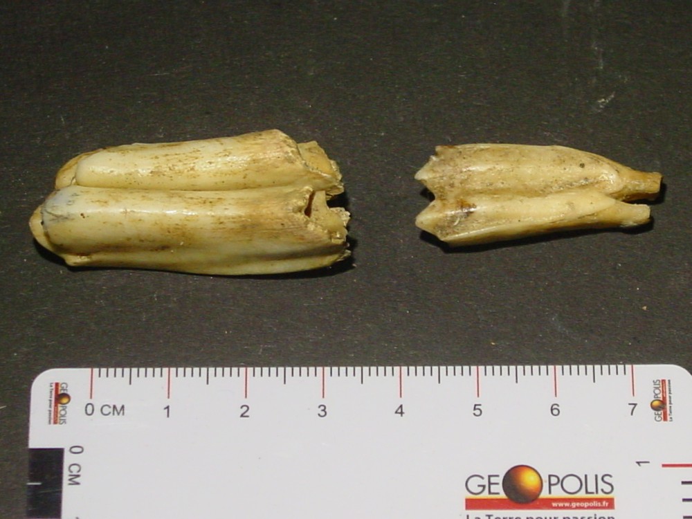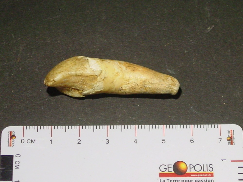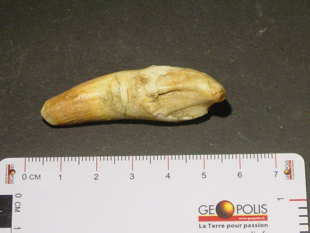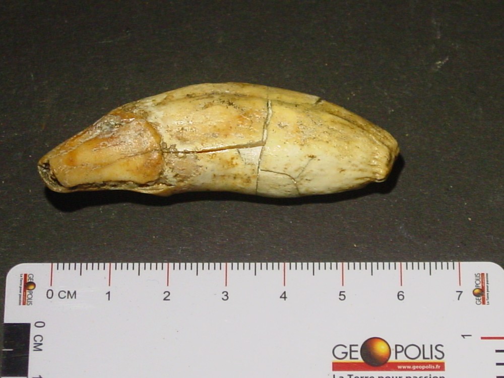 Bonsoir Déjà merci pour vos infos C'est vrai, j'ai oublié de mettre l'échelle ! Il faut dire que j'ai fait cela assez rapidement car malheureusement j'ai pas mal de chose à faire où je me trouve actuellement (maison familiale) car ce n'est pas mon lieu de résidence principal (Normandie) et toutes mes collections de minéraux & fossiles sont dans cette maison n'ayant pas la place où je réside habituellement. A part cela les dimensions sont : Dent 1a, b, c, d : L = 62 mm; e max = 14 mm Dent 2a, b : L = 53 mm; e max = 15 mm Dent 3a, b : L = 48 mm; e max = 13 mm Pour toutes les autres dents en vrac, celles-ci ne dépassent pas une longueur max de 42 mm (la plus grande) Pour les dents d'herbivore : Dent 1 : L = 42 mm; e max = 12 mm Dent 2 : L = 33 mm; e max = 7 mm Cela vous donnera quelques idées Je vous ferais d'autres photos de restes d'ours ou autres animaux (vertèbres, fragments de mâchoires, griffes, etc.) qui étaient au même endroit. Cela fait 50 ans que n'y suis pas allé et ce gisement est au bout de la grotte au fond d'un puits d'une dizaine de mètres comblé d'argile. Le problème c'est que maintenant je n'ai plus la même agilité qu'à cette époque ayant 75 ans pour y retourner, même si j'ai fait pendant 20 ans de la spéléo !!! Je possède aussi un crâne complet d'ours brun "Ursus arctos artos" trouvé au fond d'un gouffre début des années 70. J'ai eu la flemme de remonter le squelette complet qui a été récupéré par les gens de l'Université Paul Sabatier de Toulouse (5 ours au fond du gouffre) Bonne soirée, cordialement PM -