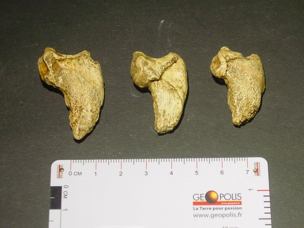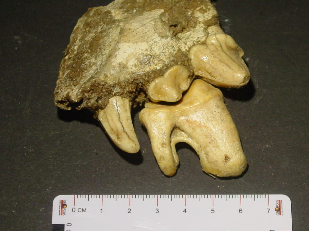Bonjour Je vous fait à nouveau parvenir les photos de canines d'ours avec une échelle. Je vous joins aussi un fragment de mâchoire (Hyène ?) Une corne d'un animal ? 3 griffes d'ours Et la photo du crane d'ours brun pyrénéen. Il me reste aussi des fragments de crane, d'os longs et 3 vertèbres. Pour le moulage, il est impeccable, dommage qu'il ne soit pas vrai pour vous Elasmo. Cordialement à vous deux PM -