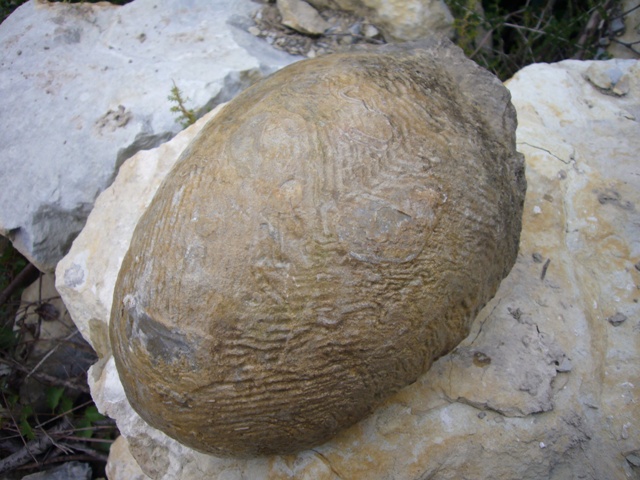 Bonjour à tous, J'ai à nouveau besoin de vos lumières pour m'éclairer sur la nature de cet échantillon. Lors d'une sortie, j'ai observé ce fossile dans les déblais d'un chantier. J'ai d'abord pensé à un gros fragment d'ammonite mais l'ornementation qui est à la surface me laisse perpelexe. Par ailleur, je n'ai pas vu de lignes de sutures, ni de cloisons. Pourrait-il alors s'agir d'un gros morceau de bivalve ? Les dimensions sont 35 cm de long et environ 20 cm de large. Datation : Hauterivien (faune associée: Toxaster, Aetostreon, Crioceratites et quelques Hibolites). Je vous remercie par avance pour vos réponses. B.