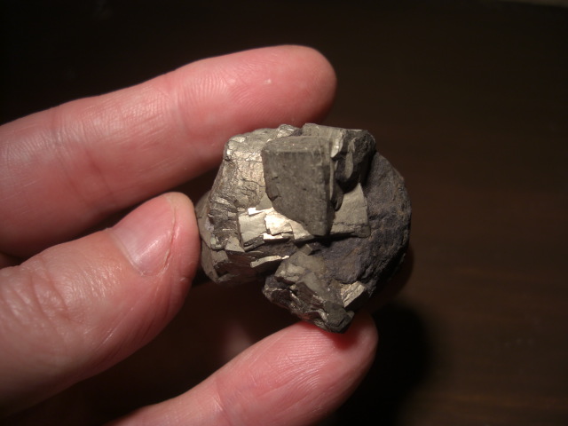Elle se présente sous forme de groupements (1,5 cm maxi) de cristaux très plats (pour du cubique, trange ou crissance contrariée) jusqu'à 7 mm, accompagnée de pyrite très fine jaune (pas de photos pour l'instant, les pièces sont loin, donc à l'occasion).