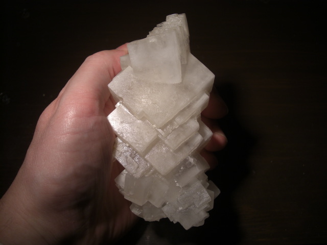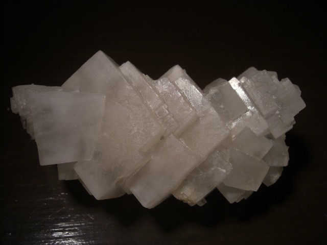 Halite, cristaux imbriqués en stalactites le dernier étant orienté différament (macle?), hauteur 13,5 cm, mine de Varangéville ,Meurthe et Moselle