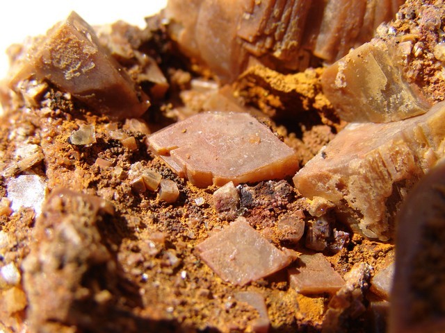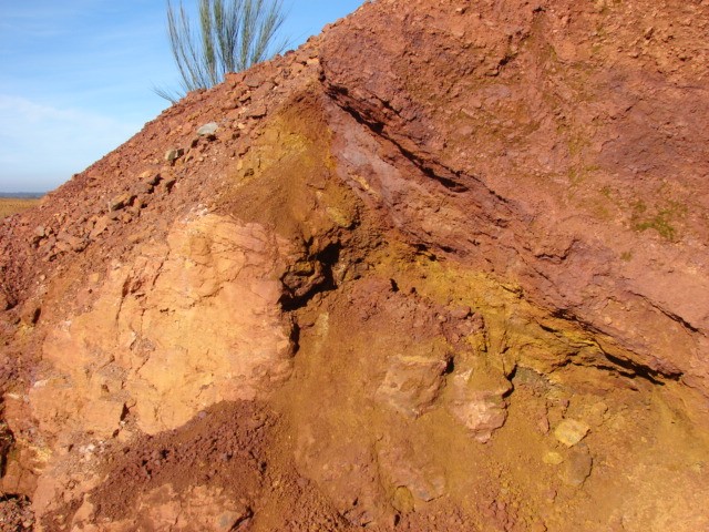 Sur cette photo, nous pouvons observer ce laminé à baryte et goethite/limonite (Partie droite), une zone pulvérulente (zone de faille??) et en partie basse les grès à imprégnations fluorées ... de nombreuses géodes avec fluorine opaque et quelques rares petits pompons de baryte jaune à rosée (3-4mm) ...
