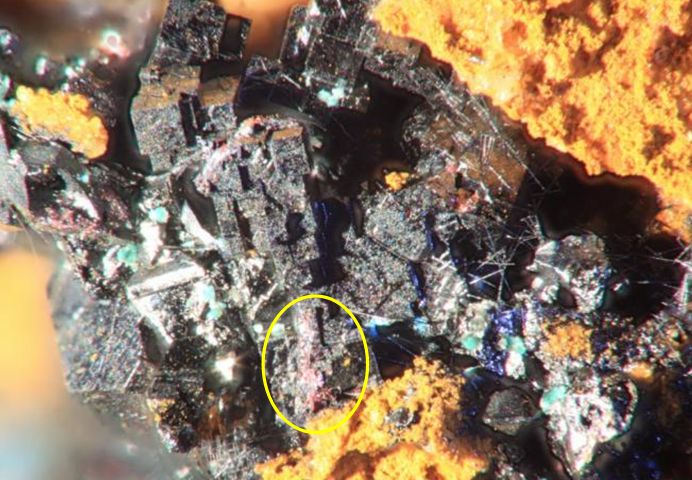 Il y aussi du cuivre natif sous cet enduit noir , il y a du jaune type tuyau de plombier sur quelques cassures .