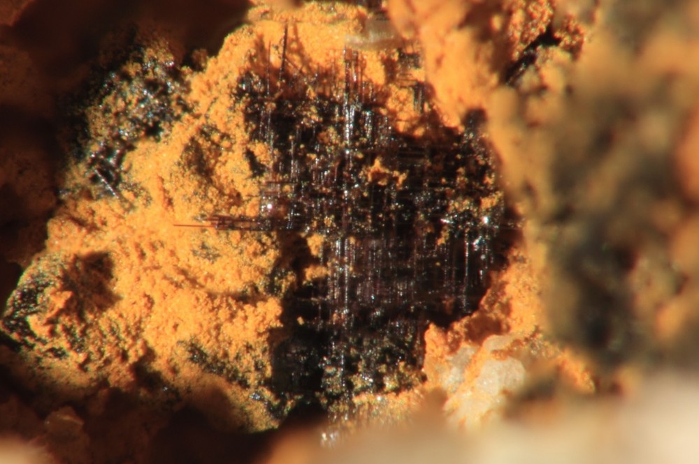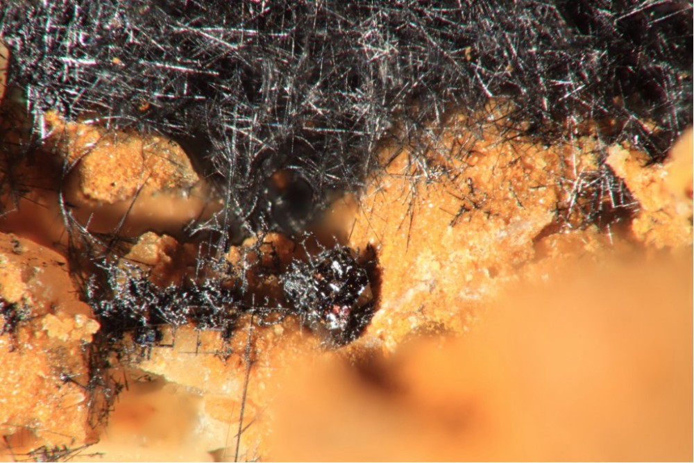 La chalcotrichite est noire avec , de temps en temps , quelques aiguilles rouges .