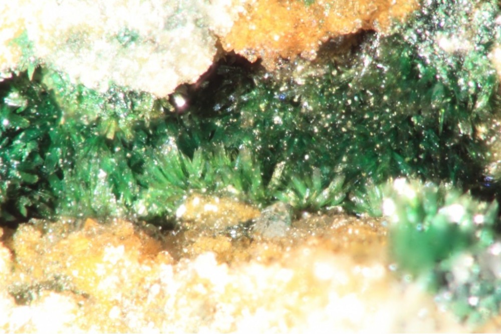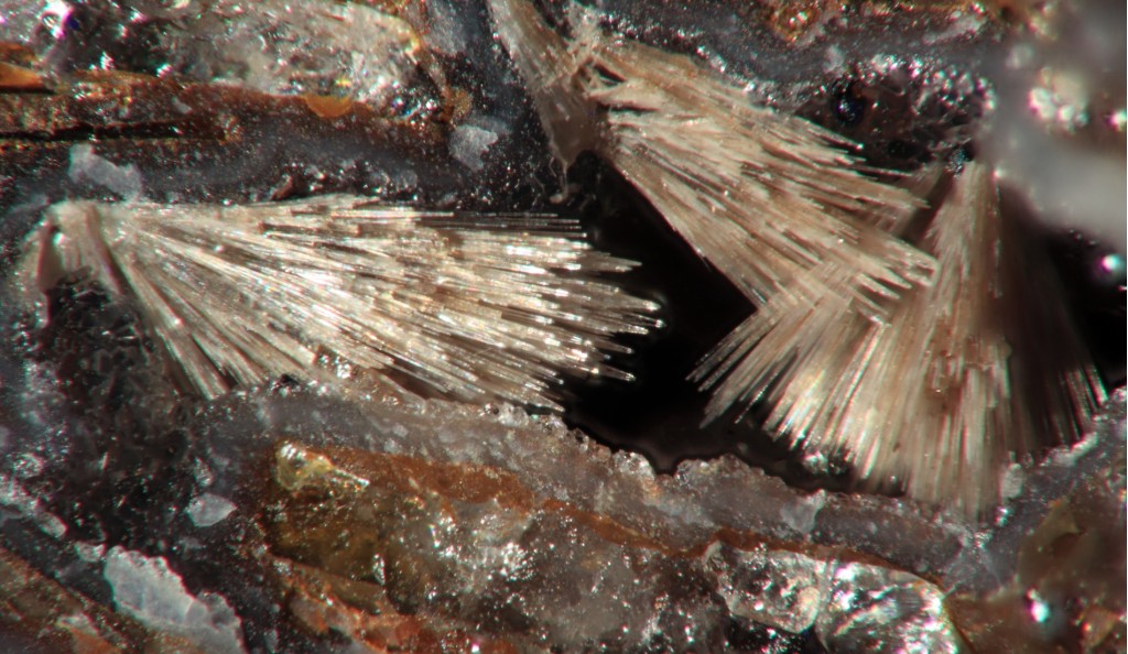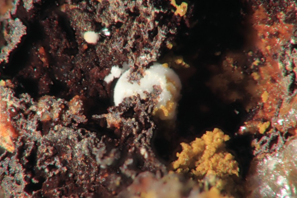 Toujours dans cette zone à cuivre natif et à cuprites , une boule blanche de cristaux aciculaires dans un petit espace .