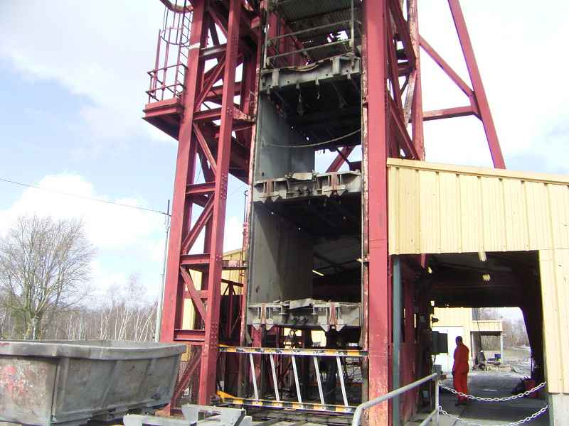 La cage double en maintenance (sortie totalement du puits). Cette cage remonte en général des crapauds (sorte de plateau sur rails). Les blocs d'ardoise sont sur ces crapauds et sciés en surface.