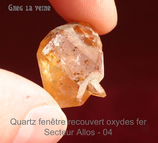 Un quartz qui présente de belles fenêtres avec des inclusions d'hydrocarbures et un petit quartz recouvert d'oxydes de fer. On en trouve rarement mais cela existe. Il est à noter que des quartz fenêtre semblables à ceux de nos pré-alpes dans les montagnes de Porreta à côté de Bologne en Italie. Là bas, c'est le must du must de les trouver avec les oxydes. Minéralogiquement, c'est certain
