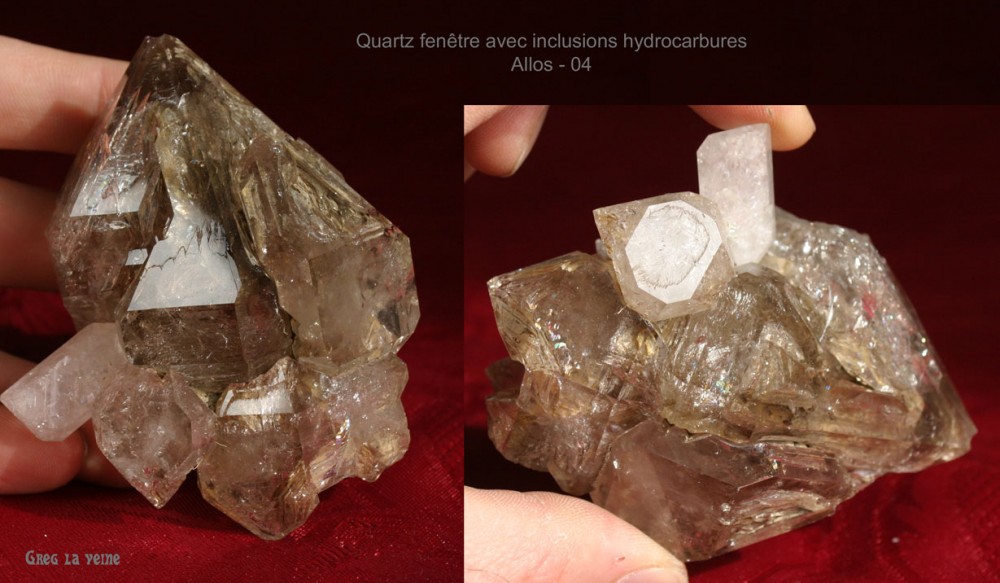 Lorsque je parle de fumé a allos il s agit de spécimens n ayant pas ,ou peu de "fenêtres" et qui présentent néanmoins une couleur plus foncée que les autres quartz du secteur.Comme je le précisais plus haut il existe également des inclusions liquides et/ou gazeuses mais toutes sont incolores et n apportent aucune couleur au quartz.