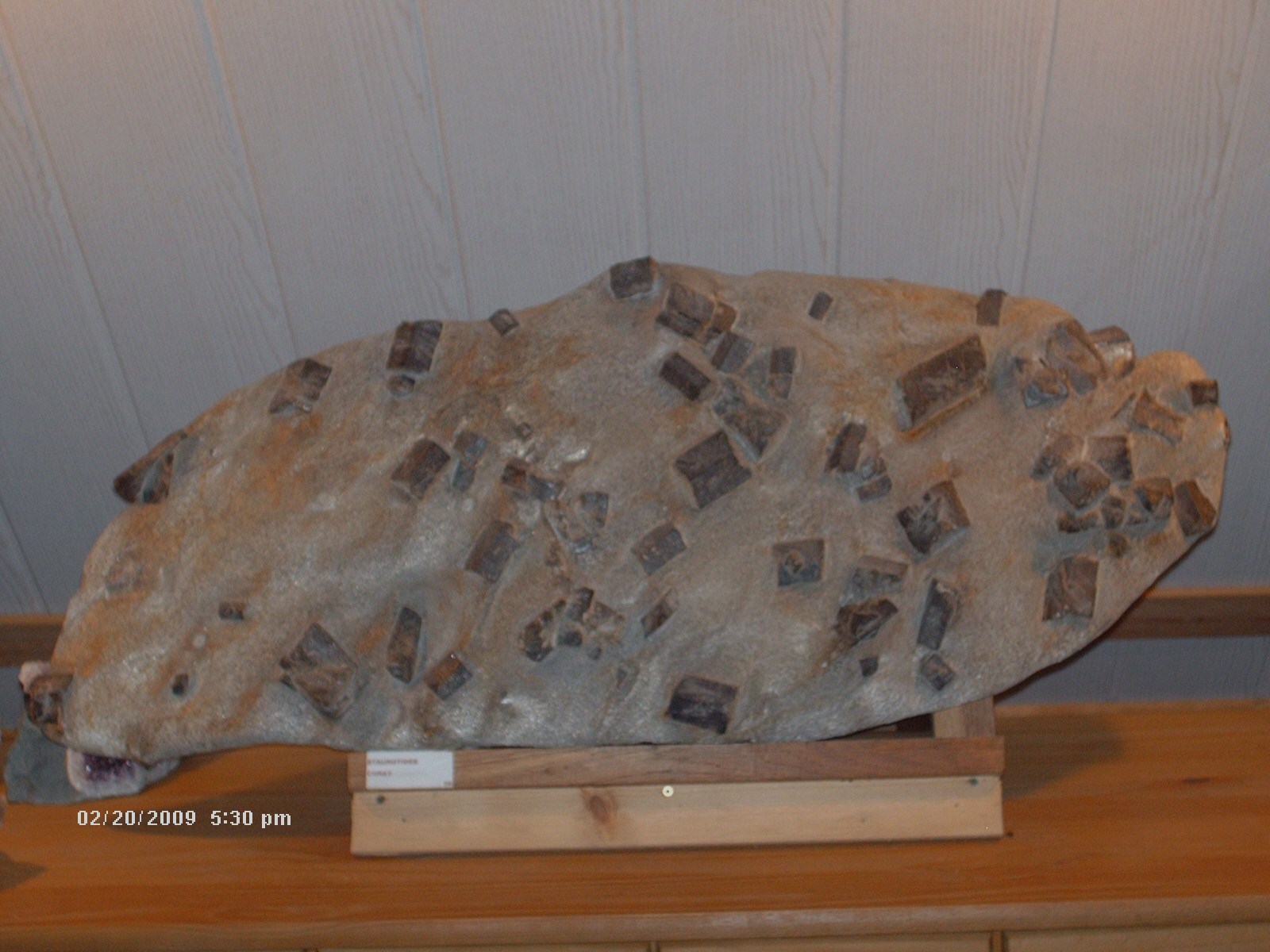 Un bois fossile du Permien d'Autun, une barytine de Maine, une fluorine de Maine, un quartz jaune de l'Argentolle, un quartz calcédonieux de Voltennes, une fluorine de l'Argentolle et une quartz fumé de Voltennes.