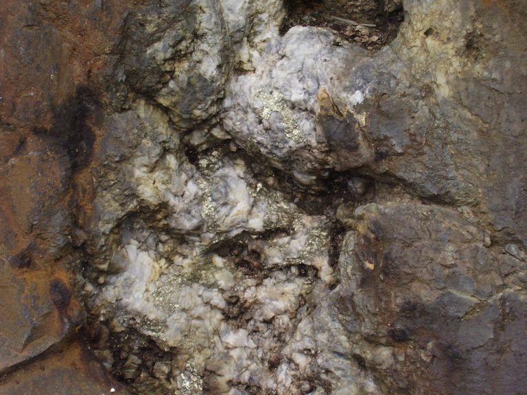 Affleurement quartz massif et pyrite, dans un filon satellite d'une intrusion de roches volcaniques dans les schistes à sulfures du secteur, avant travaux. La poche ne dépasse pas 40 cm de hauteur.