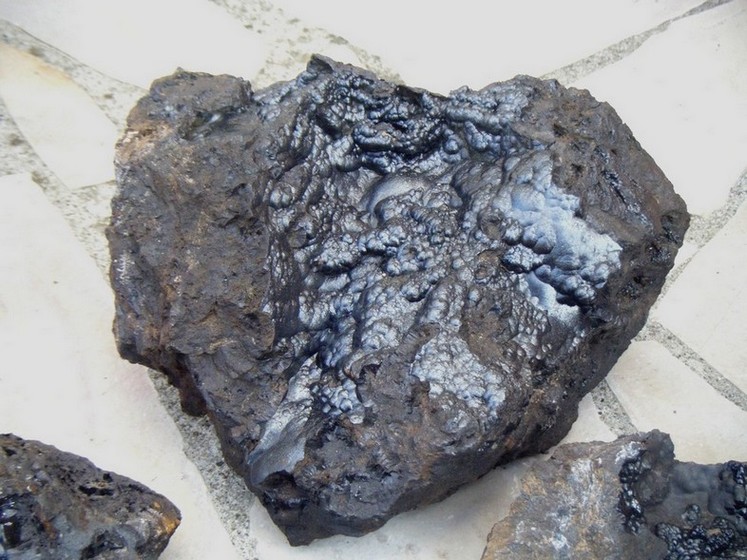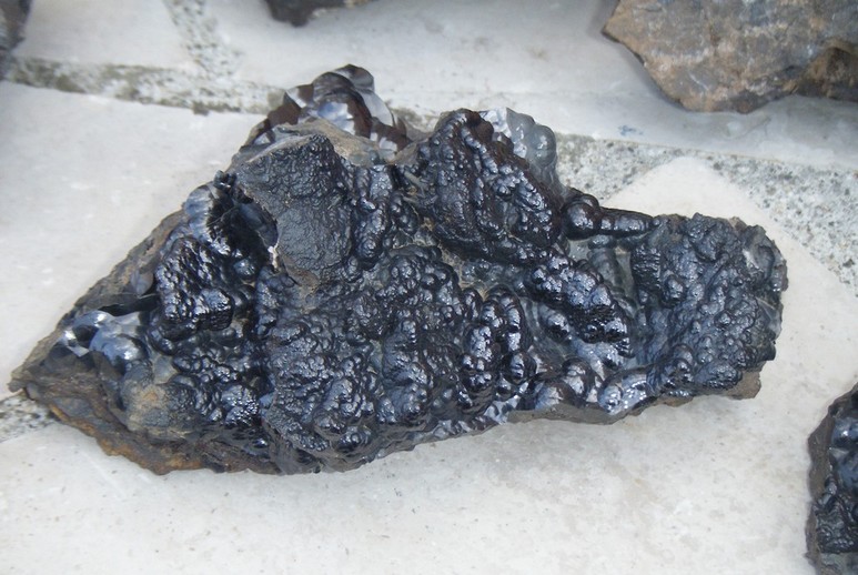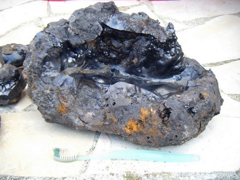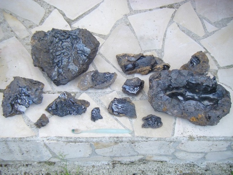 Certes la goethite en concrétion n'est pas un minéral rare, mais la qualité de ces pièces nous satisfait pleinement, d'autant qu'il y en avait pour tous les 2 : Fred a gardé des morceaux de 30 cm tapissé de goethite, moi je me suis contenté d'échantillons plus petits (pas trop de place à la maison…). Voici d'ailleurs quelques photos d'une partie de la récolte nettoyée ; nous n'avions pas d'appareil photo le jour même, dommage !