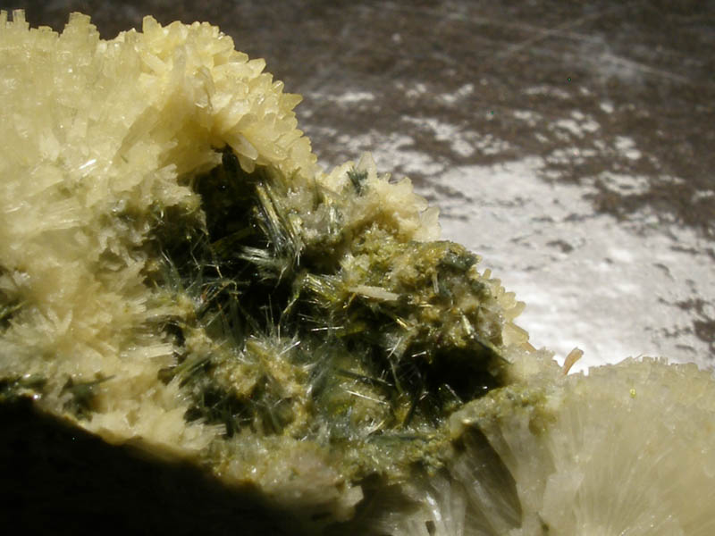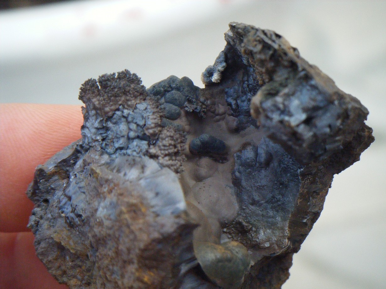 Smithsonite, wavellite... j'ai émis l'opinion, un peu plus haut, photo à l'appui, que j'avais, avec des carbonates de cuivre, trouvé un filon de smithsonite soyeuse, car couverte d'hydrozincite. J'ai cogité et me rappelle avoir lu, mais je ne sais où, que la wavellite pouvait se couvrir d'une croute type opale blanche ; or, comme l'hydrozincite, elle peut adhérer à la langue et c'est le critère qui m'a fait parler d'hydrozincite, et donc de smithsonite. Quelqu'un peut il me confirmer que la wawellite peut se couvrir d'une couche d'opale ? Je sais... c'est du ressort de l'identification, mais c'est dans les Pyrénées et c'est sur une photo un peu plus haut. J'ajoute que la couche un peu marron qui sépare la calcite de la ( wavellite-hydrozincite ? ) est seule fluo. Merci