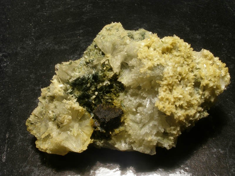 Cette fois c'était très bon: Prehnite (1 cm), actinote (7 mm), épidote (5 mm), heulandite (5 mm), pyrite (1 cm)