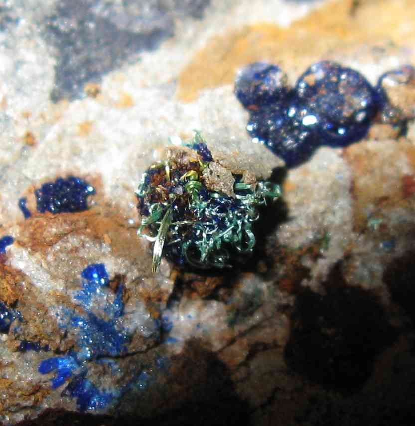 L'azurite est abondante en enduit de micro-cristaux pouvant former des placages de plusieurs cm², sur diverses surfaces (cristaux de calcite, de quartz ou directement sur la roche-mère). Plus rarement, elle forme des boules "macro" fibro-radiées brillantes d'un beau bleu. Ces boules peuvent atteindre 4 mm de diamètre. Plus rarement encore, elles peuvent supporter de la malachite sous sa forme fibreuse.