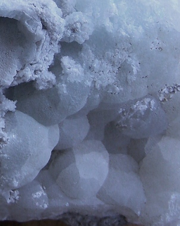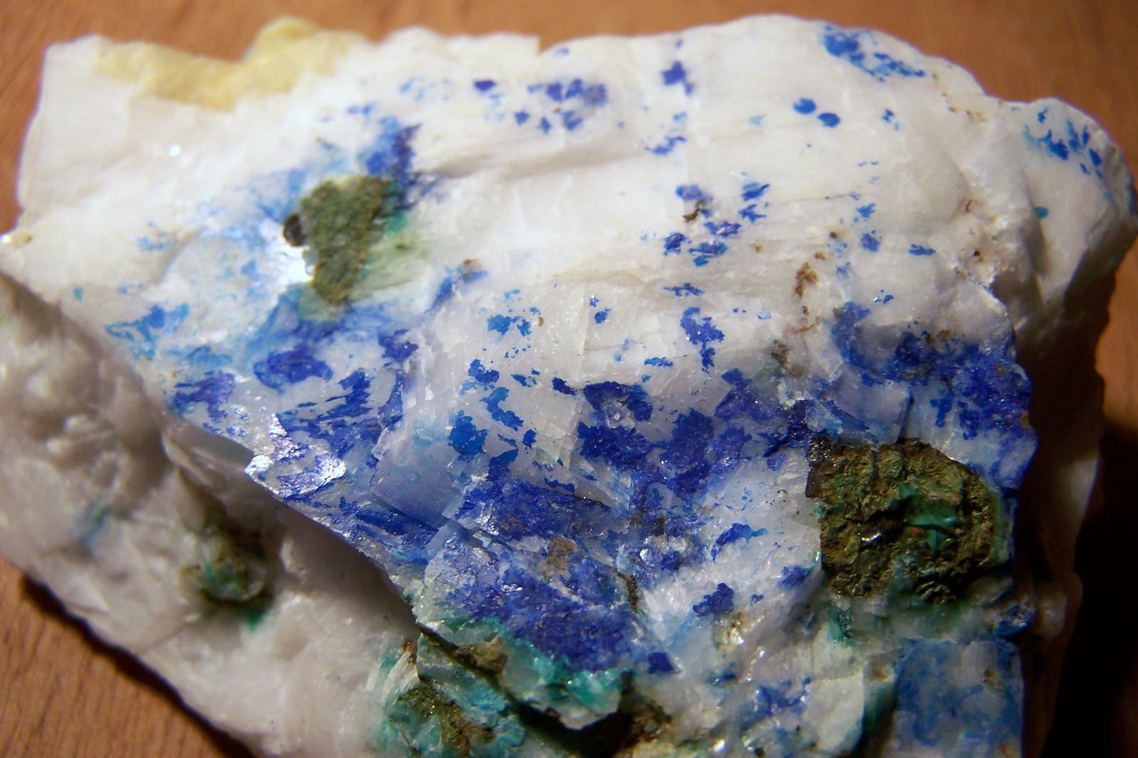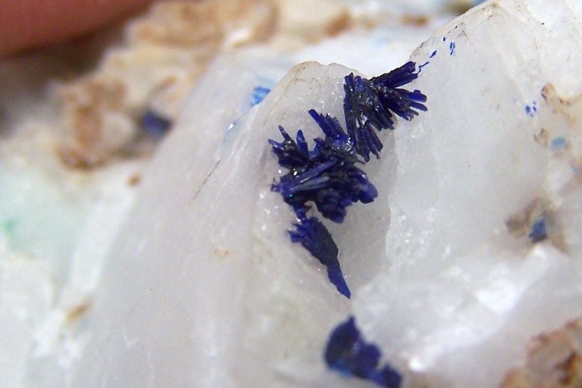 Bonjour. Un petit indice qui pourrait être prometteur, dont je pense avoir été l'inventeur il y a quelques années. Filon de calcite, encaissé dans les calcaires, gangue de chalcopyrite en cours d'altération, mêlé de smithsonite mamelonnée et fibro radiée et à la cassure lustrée. Présence de baryte très fraîche. Je pense que l'azurite cristallisée est assez rare dans nos Pyrénées centrales pour mériter une photo. France, vallée d'OSSAU.