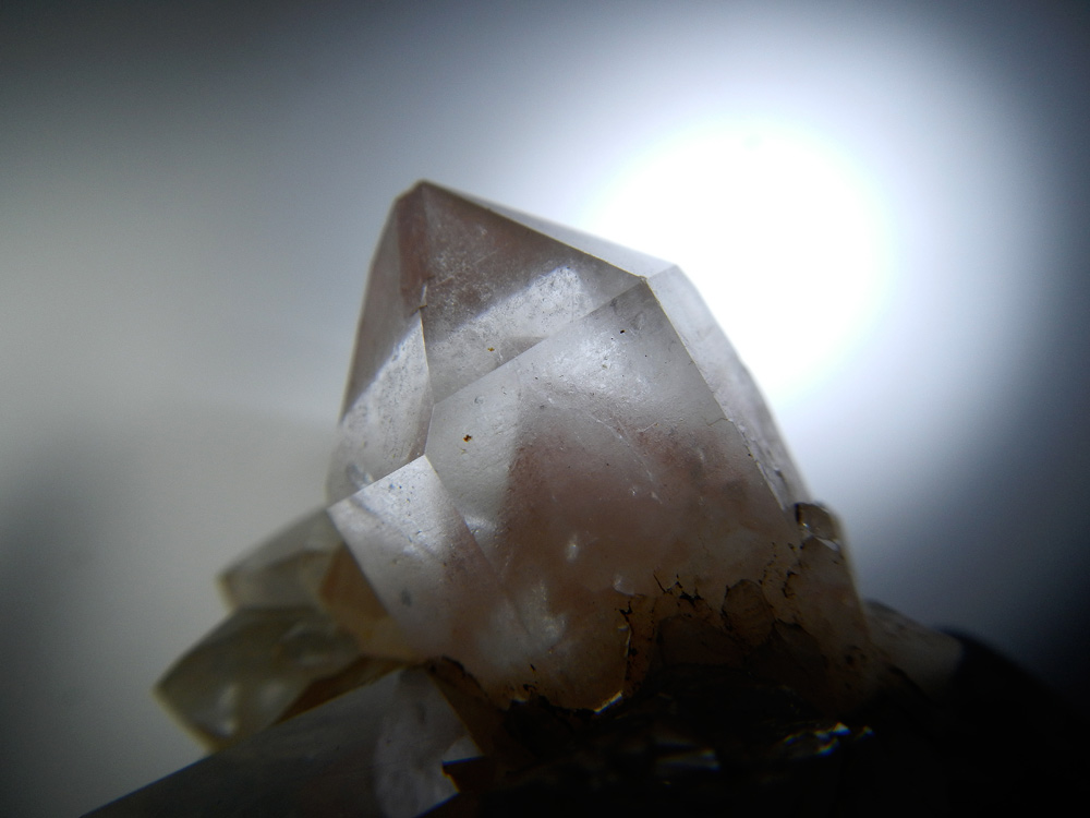 Trouvé il y a peu, une fois n'est pas coutume (en ce qu'il me concerne), un groupe (5 cm) de cristaux de quartz du 09 avec des fantômes un brin améthysés :