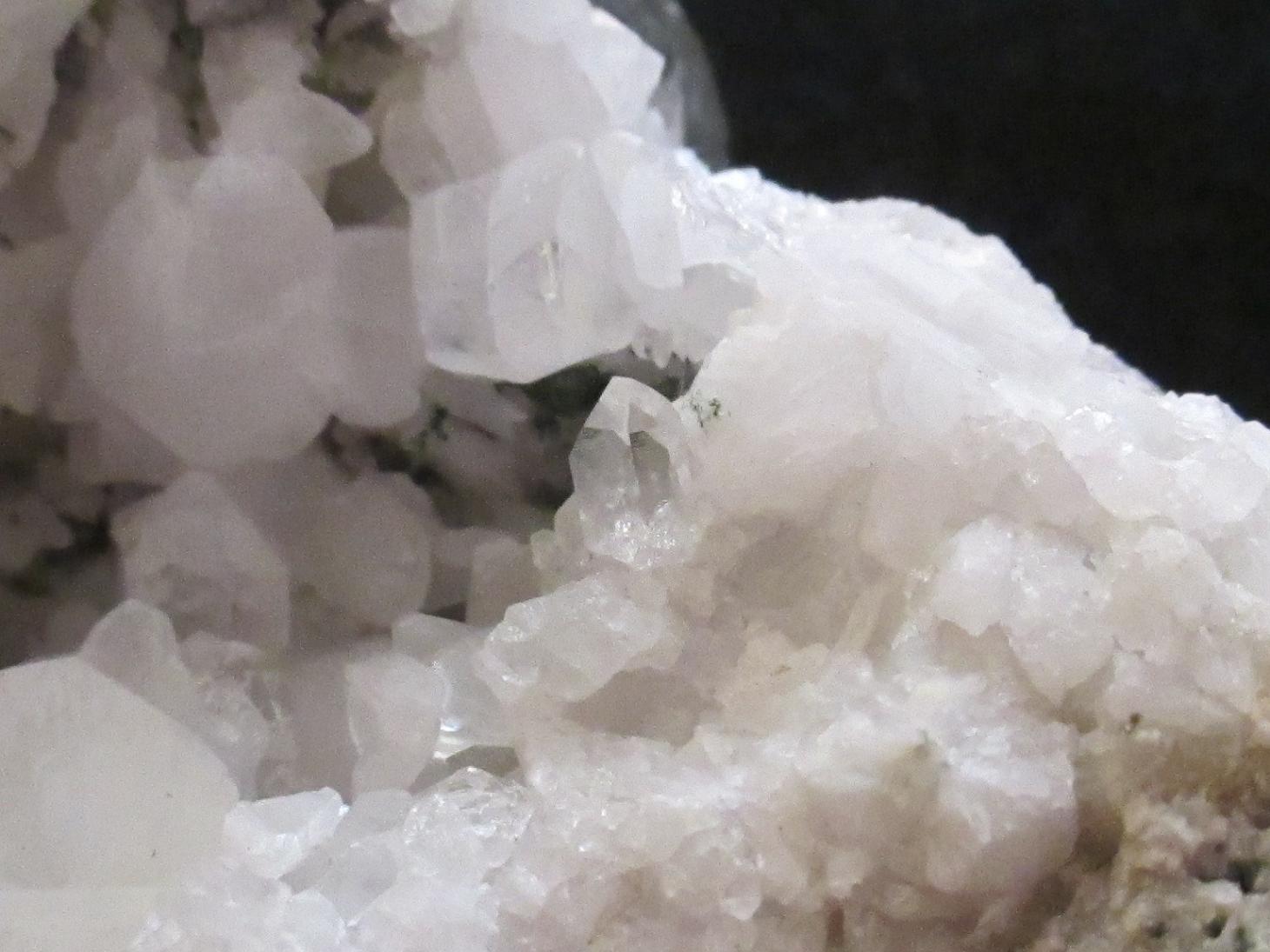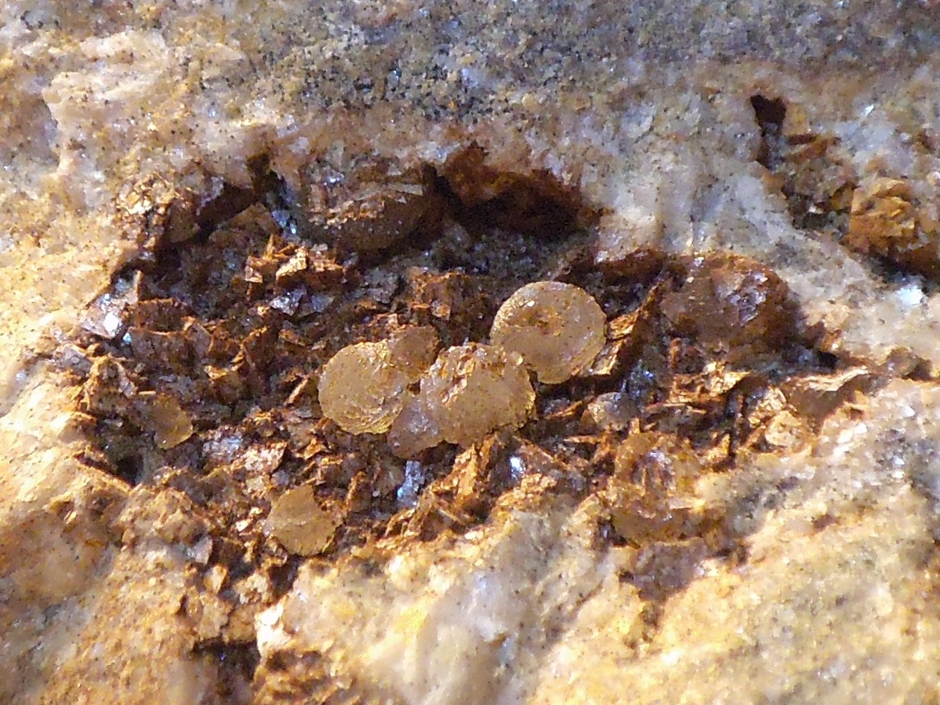 C'est tout petit (la plus grande boule fait à peine plus de 2 mm de diamètre) et translucide, incolore. C'est dans une petite géode de carbonates - à la couleur je dirais sidérite ou ankérite.