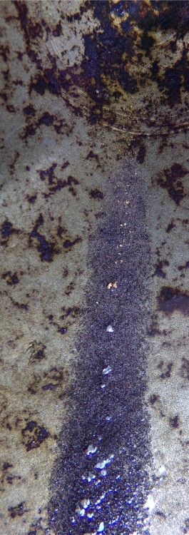 En observant des fonds de batées réalisées dans le Salat entre Seix et Soueix (au niveau du Pont des 4 Chemins pour ceux qui connaissent), j'ai eu la curiosité de les éclairer aux UV. C'est incroyable la quantité de scheelite que l'on observe à 250 nm. A la bino, on se rend compte que ces grains fluorescents ont tous la même granulométrie très fine, ils proviennent donc sans beaucoup de risque de se tromper de la mine d'Anglade, à près de 20 km en amont. Je me demande quelle est la quantité de minerai qui a ainsi été perdue et se trouve dans les stériles de la laverie et répartie sur tout le cours du Salat. Heureusement que le tungstène n'est pas toxique !