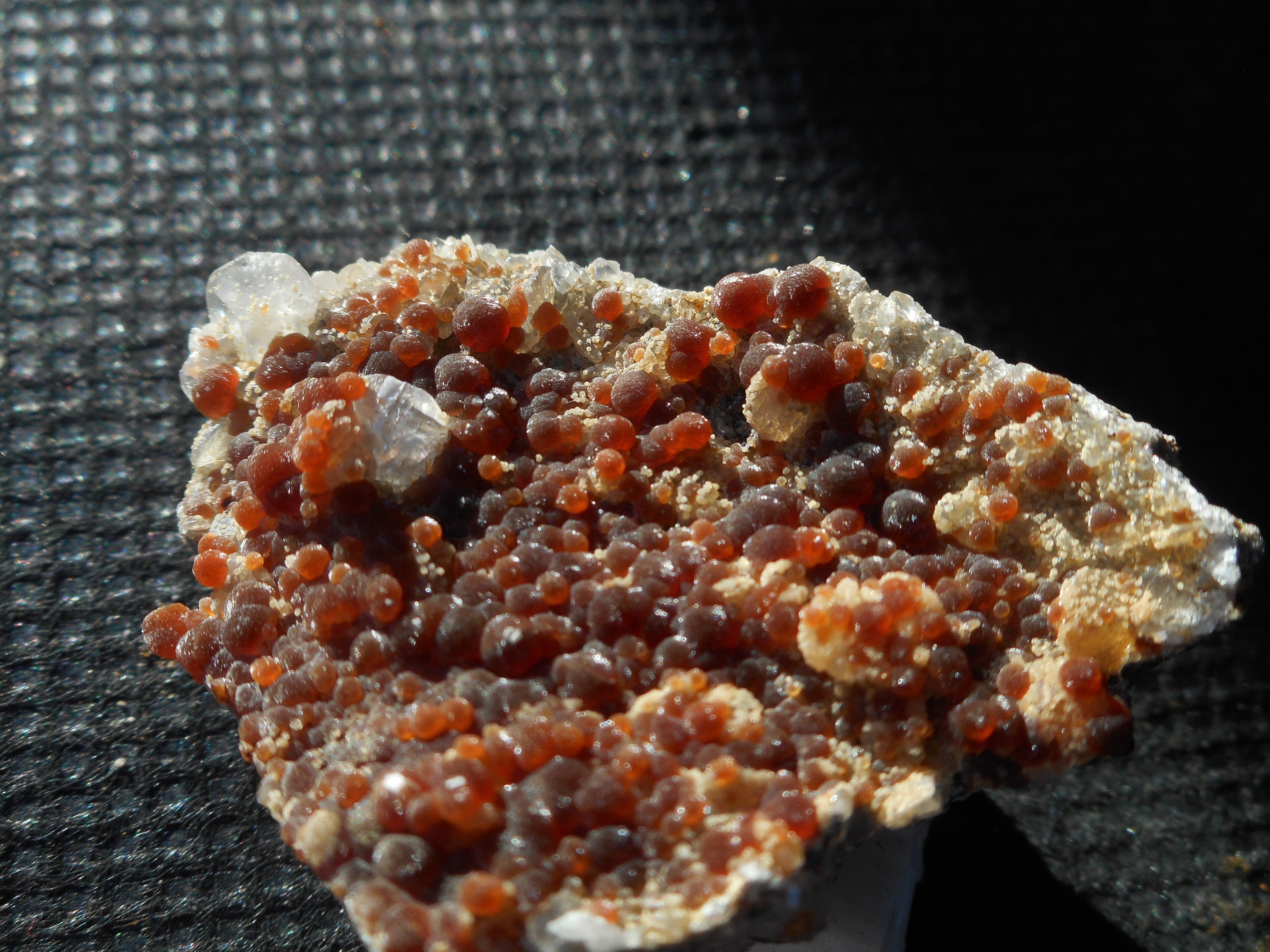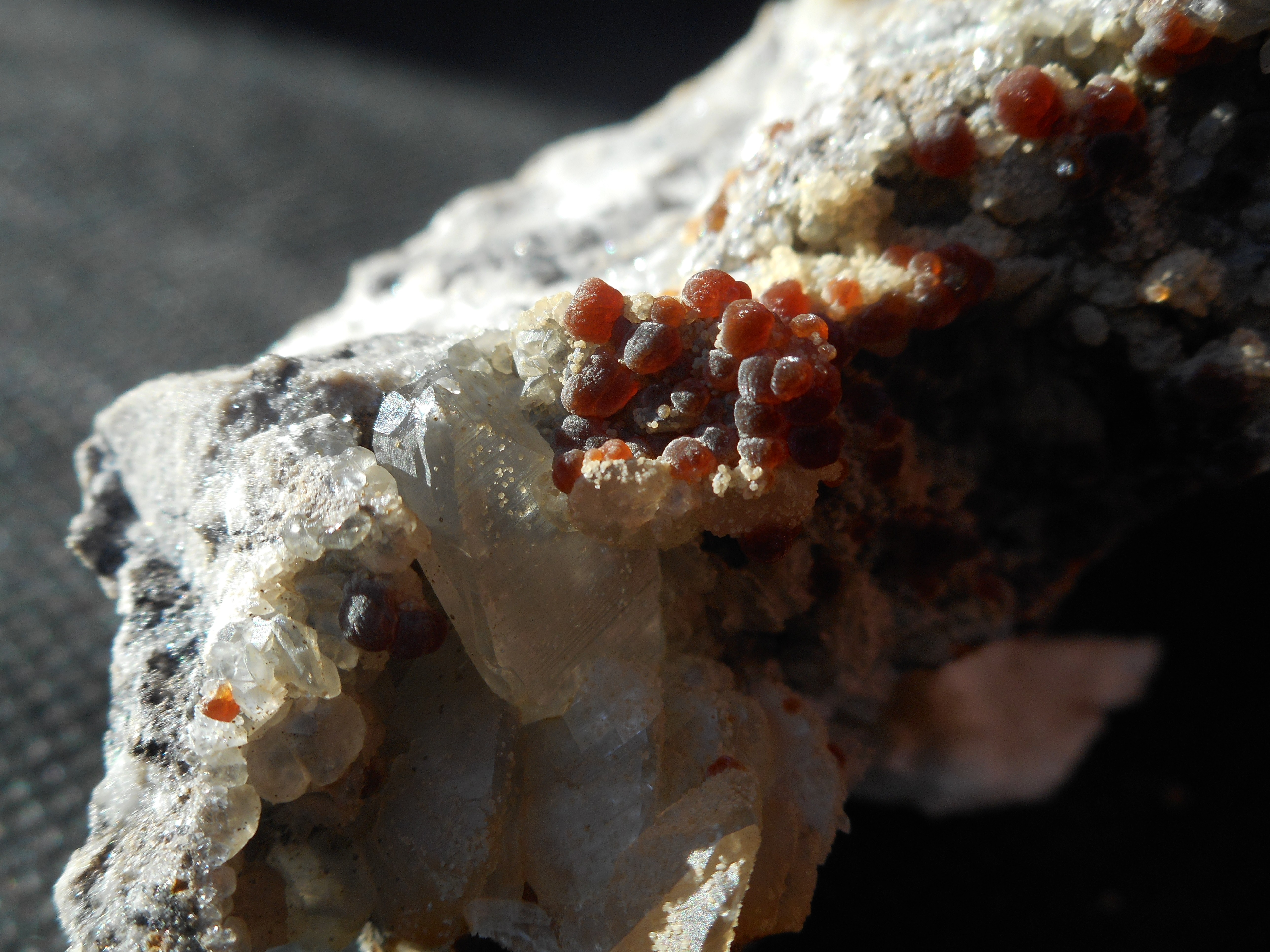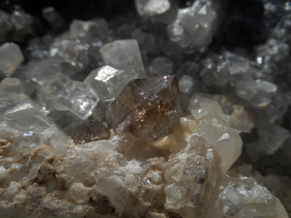 On pourra me reprocher de ne pas nettoyer cette calcite. J'assume…  Le plus grand cristal en bas à droite doit faire 1 cm et des poussières.