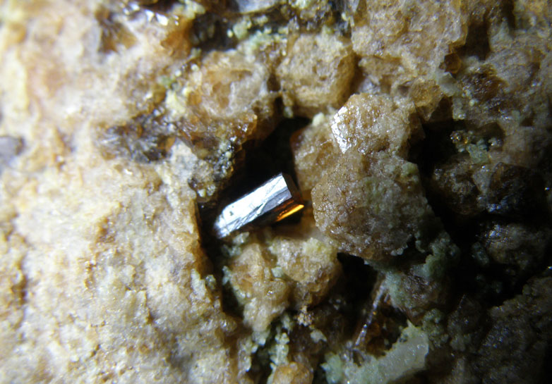 Certes le site à grenat et idocrase n'est sans doute pas très connu mais il est quand même régulièrement visité; certains blocs éclatés montrent des traces d'activité récente, sans doute même de cet été déjà. Moi, j'ai juste retrouvé le site grace à d'anciens témoignages (ou plutôt des témoignages d'Anciens, donc c'est connu !). En revanche, je ne suis pas certain que ces jolis petits prismes d'idocrase avaient été découverts (je pense que si, quand même, je ne suis pas le premier ou alors faudrait un bol monstre...même si cela semble bizarrement étonner quelques "grands" chercheurs locaux...). Par contre, pour barite et galène, cela semble être vraiment nouveau (dans ce secteur) et ce n'est pas pour le grenat et l'idocrase que je garderai le lieu un peu secret mais plutôt pour cette assoc moins fréquente (le temps d'une prospection plus détaillée, cette semaine...).