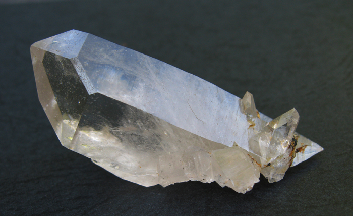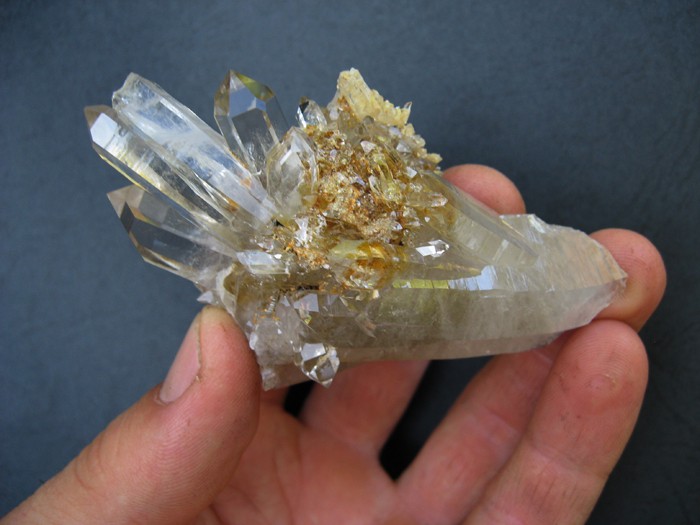 Pour répondre à Greg rapidement : oui l'épidote est entièrement "dedans" mais elle est légèrement en "biais" par rapport au quartz : elle devait à priori ressortir et être (peut-être) terminée...Mais ce quartz et deux autres sans épidote est bien tout ce qu'a livré cette fente qui se referme très rapidement sans espoir de "réouverture" plus profonde; ils étaient en vrac dans le "fond", désolidarisés d'une éponte à tous petits cristaux (quartz + clinozoïsite sans doute + albite + chlorite locale) : les glaciers puis le torrent proche ont dû emporter des merveilles avec eux...