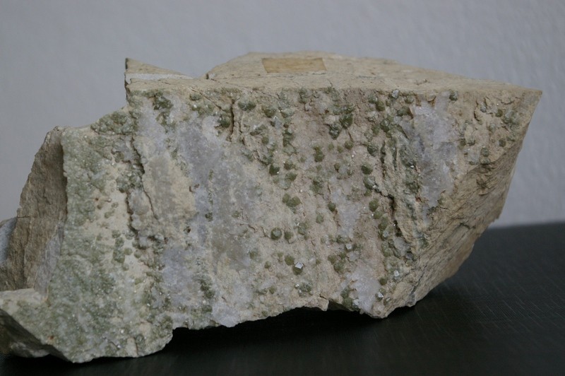 Une photo d'une pièce qui me fut donnée ? échangée ? vendue ? il y a un quart de siècle pour du grenat vert (pâle) pyrénéen. Le support me parait être soit un grès fissuré à grain très fin, soit une aplite.