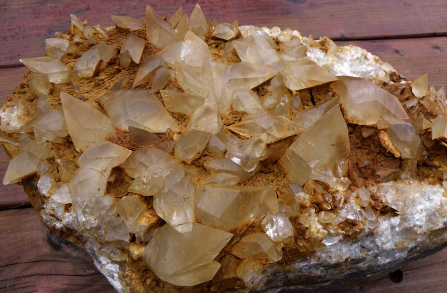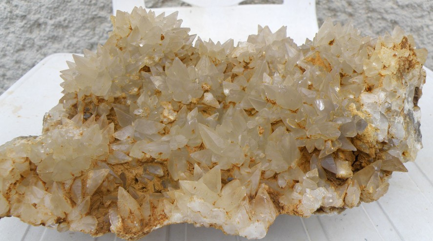 La semaine dernière, j'ai trouvé deux fentes/poches dans une carrière bien connue au sud de Pau (faciès minéralogiques caractéristiques...). J'ai commencé à ouvrir ce jour là et nous avons poursuivi le travail avec Maurice ce samedi. La première poche, très argileuse, donne des calcites de couleur "miel" avec des petits cristaux au "toit" et des gros cristaux, souvent "doubles" au "mur", posés sur les pointes des petits pointus (n'ont résisté intacts que rarement au dynamitage de la paroi...). La fin de la poche est caractérisée par des petits hérissons de calcites assez esthétiques. La deuxième poche, plus étroite, a donné des cristaux étonnament plus gros mais je trouve un peu moins jolis. Cependant les couleurs sont différentes avec une nuance bleutée pas vilaine...Il y a une série de deux ou trois filons de roches basiques qui traversent la carrière : dedans, des petites vacuoles avec calcite, chalcopyrite, préhnite et quartz limpide (peut-être Maurice montrera des photos car je n'ai pas pris d'échantillon provenant de là)...