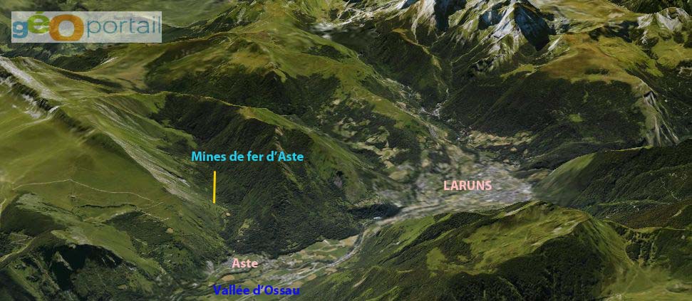 Ce gisement de fer est connu … depuis bien longtemps puisqu’il fût le siège d’une exploitation au moins dès 1650 (parions que les romains avaient déjà fureté par là); le minerai étant fondu alors aux forges de Béon (qui utiliseront aussi le minerai de la mine de Barburet (Louvie-Soubiron, Ferrières) et de la Groute (Arbéost – je n’ai pas retrouvé ces entrées, malgré une visite approfondie de la rive gauche de l’Ouzoum : si quelqu’un sait où elles sont…) pendant la Révolution et jusqu’au XIXème siècle). L’activité minière concentrée à flanc (abrupt) de ruisseau était articulée autour de 3 galeries superposées verticalement et distantes de 10 à 20m les unes des autres, la plus profonde étant la galerie inférieure qui, comme la galerie intermédiaire inclinée, sont actuellement noyées.