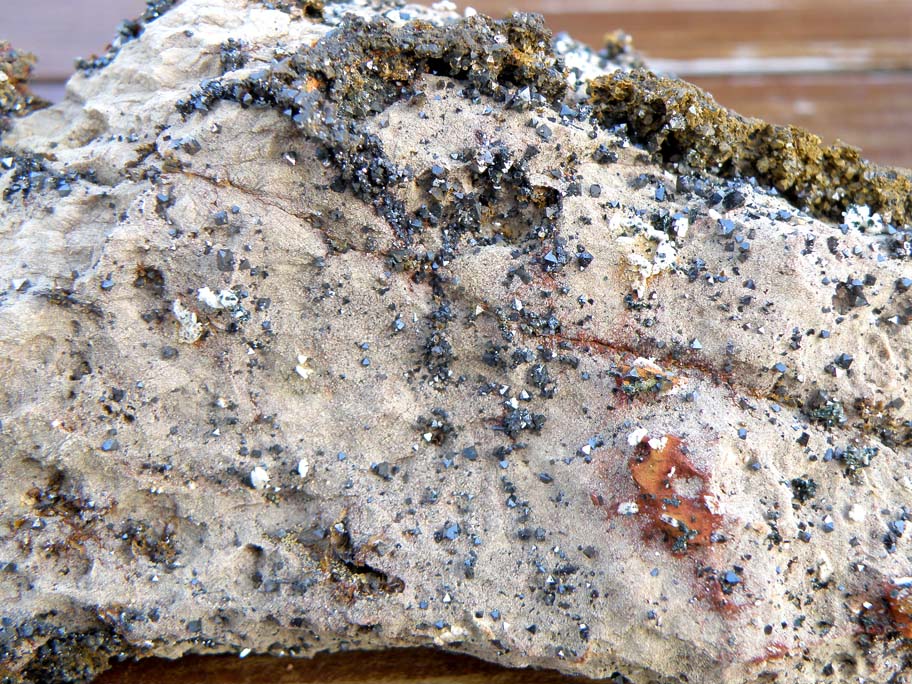Photo 3 : un bloc de calcaire (champ de la photo = 10-12cm) montrant la multitude de magnétites (petites), ainsi qu'une frange altérée à hématite (haut de l'échantillon)