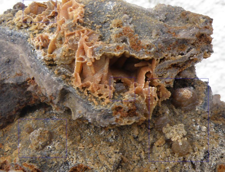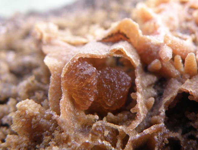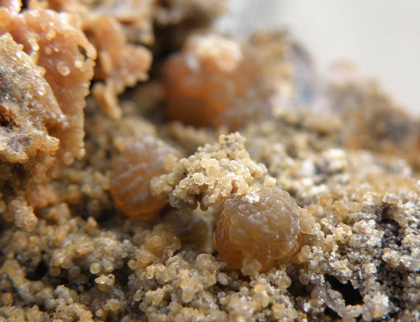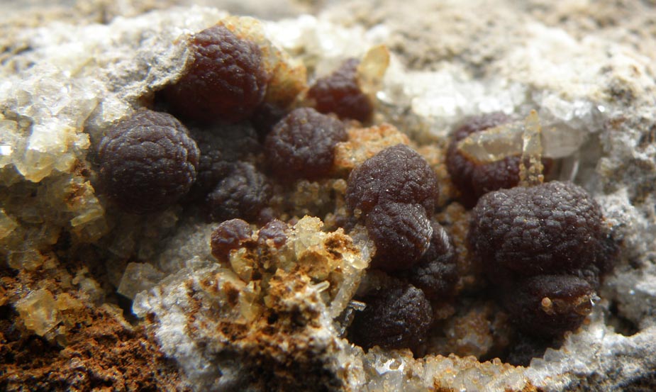 Un seul bloc trouvé avec ces cristallisations en boules. Il y en a plein le bloc qui occupent des petites cavités. Par-dessus, souvent, un truc qui ressemble ou qui mime de la calcite mais qui ne bouge pas aux acides (je n'ai pas essayé sur les boules, mais si c'est ce que je crois, il ne vaut mieux pas...).