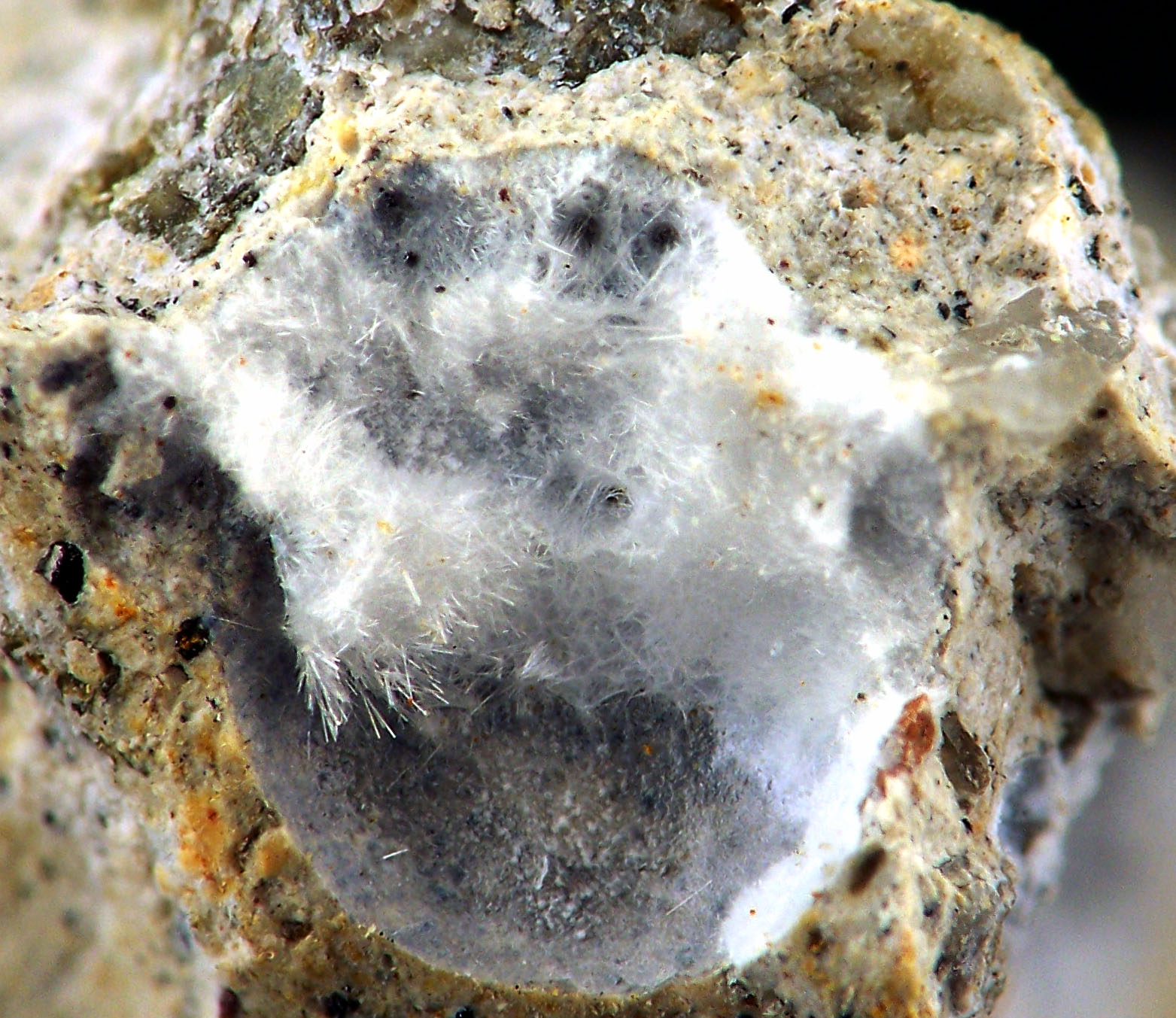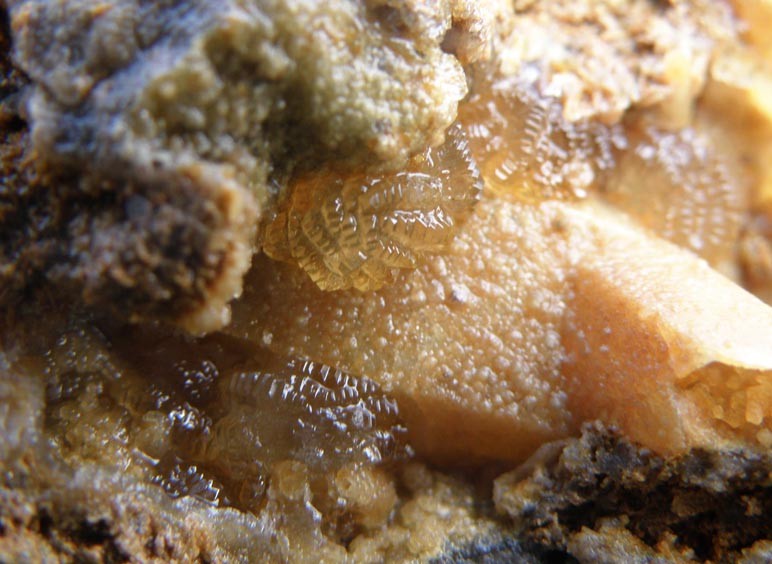 Photo 6 (message suivant) : dans un autre échantillon, dans une petite cavité avec calcite.