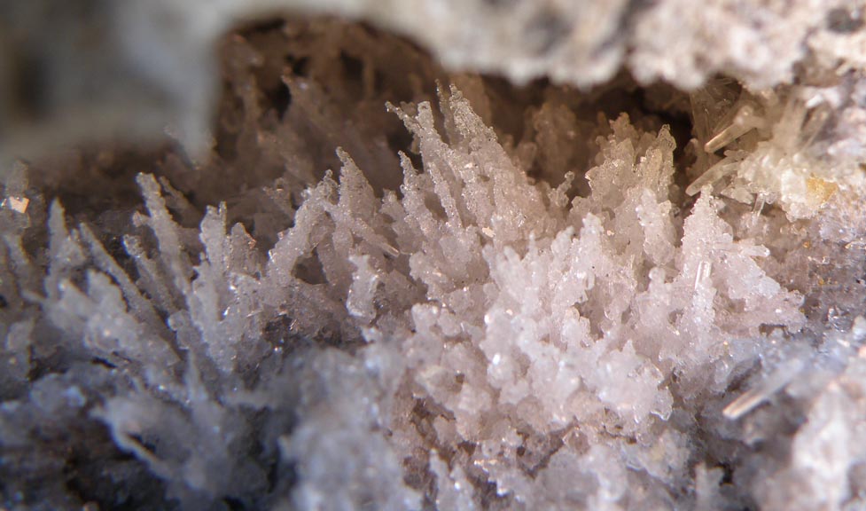 C'est à peu près dans le même environnement que les hémimorphites montrées l'autre jour. Le calcaire sableux un peu (beaucoup) pulvérulent, bourré d'oxydes bruns, montre quelques-fois des vacuoles (parfois grandes = 20cm de diamètre) avec ça dedans qui tapisse toutes les parois des vacuoles (cela peut faire 3-4cm de haut)...je reconnais des petites pointes de calcite, de la fluo translucide mais les minéraux blancs à transparents en gerbes me sont inconnus (semblent formés de petites granules empilées) !!